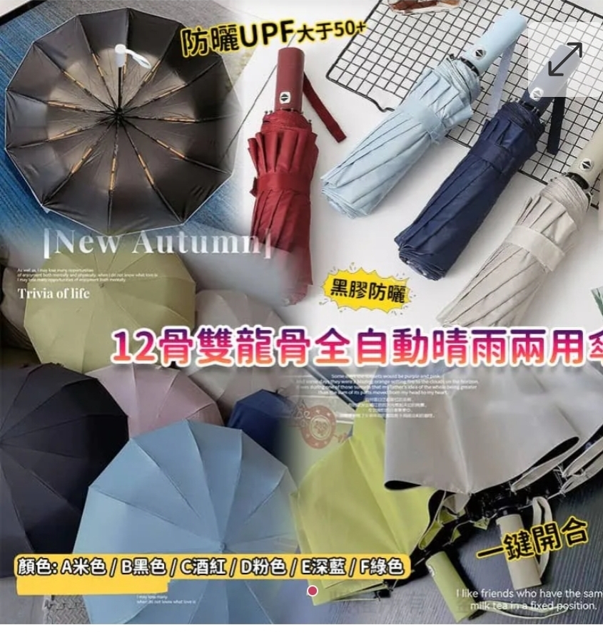$55把. 2把或以上:$45把. 12骨雙龍骨全自動晴雨兩用傘 ⛔截單日期:2025/10/26 06:00PM 📦預計貨到日:12月頭 A.米色 B.黑色 C.酒紅色 D.粉色 E.深藍色 F.綠色 ✔️12骨雙龍骨,順滑開關 一秒開合 ✔️106CM加大金面,遮陽遮雨 ✔️黑膠防曬,防曬UPF大於50+ ✔️暴風不摺傘骨,強力抗風擋雨 ✔️一鍵自動開關,易開易收 ==⚠️ 聲明 ⚠️== 1.本貨品為平行進口正貨。 2.所有帖文內容只作分享及參考用途。為免混淆視聽,所有商標或版權均屬有關商品品牌商標的持有人,敬請留意。 3.空運/海運有可能因各種不明因素影響而延誤到貨,所有貨品一經訂購後,如非廠家缺貨,不設取消/退貨/換貨。 4.貨品在運輸途中導致產品包裝外盒有任何損毀凹陷,但不影響其產品本身食用/使用,或有機會不預設外盒出貨,我司不會作任何更換或退款。 5.以上資料及外盒包裝只供參考,商品外盒原廠有更換新包裝權利,一切以實物為準。 6.顏色或因拍攝器材或顯示螢幕等因素而與實物有異,以上圖片及文字僅供參考,一切以實物為準。