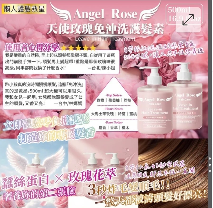 $55支. 2支或以上 $45支. Angel Rose 天使玫瑰護髮素 500ml (免沖洗) ⛔截單日期:2025/12/24 06:00PM 📦預計貨到日:3月中 — 3 秒順髮 × 滑到會發光 × 一整天玫瑰飄香 — 💗 一抹就有「天使光圈」 像在髮絲上灑下一層柔亮濾鏡, 毛躁乍看消失、分岔被瞬間撫平, 整頭髮像剛做完專櫃級護髮一樣—— 柔順、亮澤、超級好摸。 🌹 大馬士革玫瑰花萃 × 蠶絲蛋白精華 每一次按壓都像在幫髮絲做玫瑰 SPA, 香氣高級、細膩、帶著淡淡晨露感, 讓你轉頭的每一秒,都散發仙女感的「自然髮香」。 ✨ 3 秒瞬吸,完全不油、不黏、不厚重! ✔ 一整天持續「玫瑰女神香」 甜、乾淨、昂貴感十足,連走過都能留下溫柔香氣。 ✔ 雙重保濕因子,吹後依然蓬鬆柔亮 ✔ 細軟髮專屬天菜 零黏膩、零負擔,抹越多越蓬越香。 ✔ 受損髮救星 染燙、漂髮都能瞬間修補觸感 毛躁、乾枯、卡卡都敷平。 ✔ 免沖洗設計=護髮懶人的福音 不用沖水、不用等、不用技巧,隨時抹、隨時亮、隨時香。 ✔ 超大容量 500ml,CP 值拉滿 -產地:MADE IN TAIWAN -規格: -保存期限:生產日起計年(商品銷售速度快,依實際出廠為主。) 📣非到港還有30日,還需運送時間,無法接受短效請勿下單 -保存方式:避免陽光直射,請置於陰涼乾燥。 -注意事項: ※請確保將產品放在孩童和寵物接觸不到的地方。 ※使用後如有不適,請暫停使用並諮詢專業醫師。 ※如不小心噴到眼睛,請用清水沖洗10-15分鐘後,請立即就醫諮詢專業醫師。