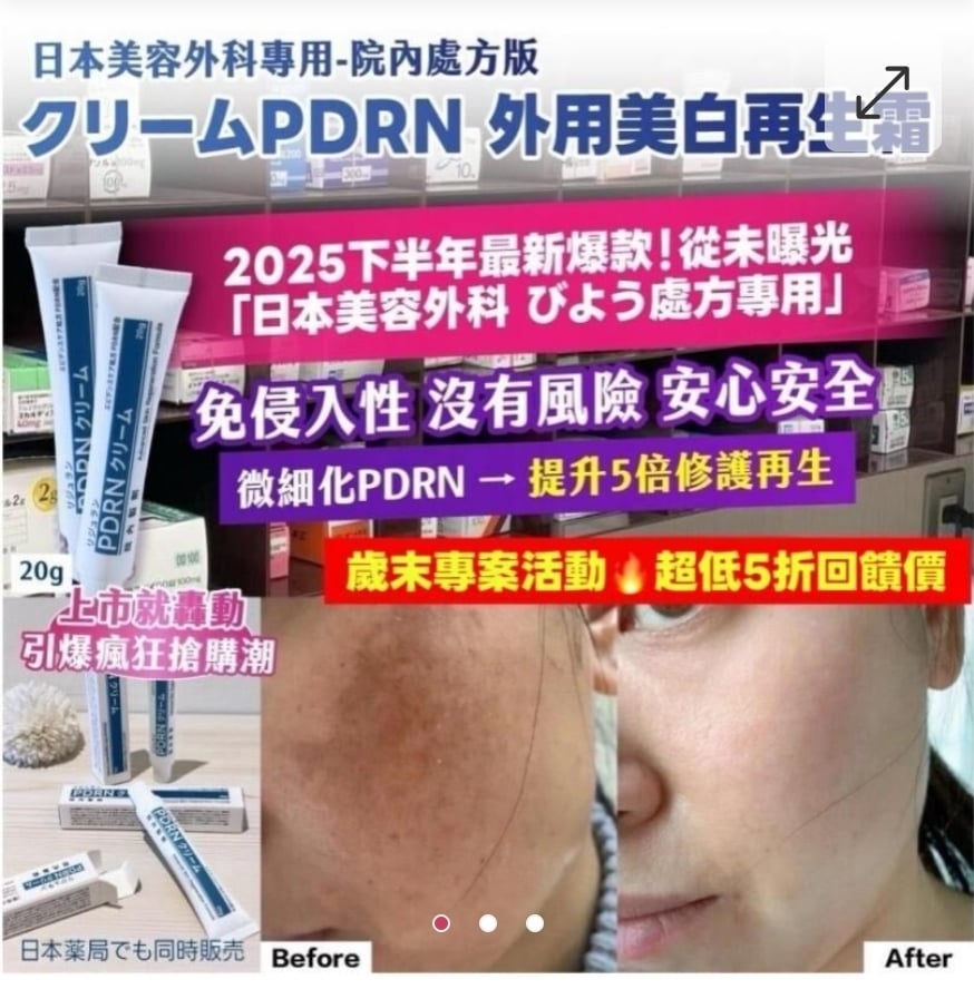 $55支. 2支起$45支. 日本美容外科專用-院內處方版 クリームPDRN 外用美白再生霜 20g ⛔截單日期:2025/12/20 06:00PM 📦預計貨到日: 2月中 2025下半年最新爆款!從未曝光 「日本美容外科 びよう處方專用」 免侵入性 沒有風險 安心安全❤️ 微細化PDRN → 提升5倍修護再生 🔥上市就轟動 引爆瘋狂搶購潮 ※日本薬局でも同時販売 🌊萃取自鮭魚DNA片段成份 它屬於「小分子核苷酸」 修護肌膚 強化屏障 效果極佳 風潮席捲全球 🔜源自於韓國爆紅麗珠蘭水光針 日本現在也跟上腳步 這隻塗抹式水光 效果讓你一次就驚豔 新品推出不到48小時⏰ ✈️訂購量居然就衝到30,000支 ✅美容皮膚科学スキンケア ✅弾力はじける水光肌へ 業界唯一取得販售資格 絕不含西藥 🏥エビデンスケア処方 ✨話題の成分「PDRN」を配合 💧ハリツヤ×保湿ケア ⚖️DNA-NA(整肌成分) ✅白皙透亮、延緩老化、恢復彈性 ✅擊退黑色素、抑制斑點形成 ✅分解色素沉澱、均勻膚色 醫能級專業配方 執業藥師共同研發 🔹PDRN-(鮭魚DNA生物活性成份) - 擊退黑色素、淡化細紋 🔹積雪草+泛醇B5-延緩肌膚老化、潤澤修護 🔹膠原蛋白-告別暗沉、瞬亮發光、淡化瑕疵 ▪️使用方式:早晚皆可使用,於每日最後一道保養程序,取適量均勻塗抹於全臉。 產地:香港(日本共同開發) 效期:2028/10/27 ==⚠️ 聲明 ⚠️== 1.本貨品為平行進口正貨。 2.所有帖文內容只作分享及參考用途。為免混淆視聽,所有商標或版權均屬有關商品品牌商標的持有人,敬請留意。 3.空運/海運有可能因各種不明因素影響而延誤到貨,所有貨品一經訂購後,如非廠家缺貨,不設取消/退貨/換貨。 4.貨品在運輸途中導致產品包裝外盒有任何損毀凹陷,但不影響其產品本身食用/使用,或有機會不預設外盒出貨,我司不會作任何更換或退款。 5.以上資料及外盒包裝只供參考,商品外盒原廠有更換新包裝權利,一切以實物為準。 6.顏色或因拍攝器材或顯示螢幕等因素而與實物有異,以上圖片及文字僅供參考,一切以實物為準。