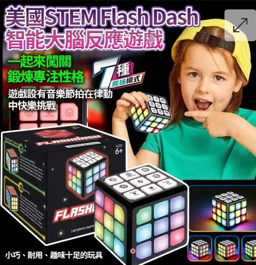$55盒. 2盒或以上每盒$45盒. 美國STEM Flash Dash智能大腦反應遊戲 ⛔截單日期:2025/11/26 06:00PM 📦預計貨到日:2026年1月中 ❌美國原價 $19usd =1xx❌ ✴️供應商減到 $45✴️ ✅以燈光遊戲提升記憶力與專注力:這款益智遊戲魔術方塊可增強手眼協調能力、反應速度與記憶力;小巧便攜~~ ✅用趣味反應遊戲挑戰速度:玩「追逐」和「抓住我」遊戲;快速按下紅燈,躲避綠燈,抓住藍燈;這款電子益智遊戲在每一輪遊戲中都考驗速度、專注力和準確性。 ✅學習模式並培養記憶力:掌握「跟隨」和「記住我」模式,提高模式記憶力;這款魔術方塊為孩子們提供引人入勝的STEM玩具,並能伴隨孩子的技能水平不斷提升。 ✅享受燈光秀和多人遊戲:每輪遊戲結束後按下燈光秀按鈕,即可欣賞精彩的燈光秀;非常適合家庭遊戲,適合任何技能水平的兒童和成人。 ✅小巧、耐用、趣味十足的玩具:這款2.75吋的魔術方塊經久耐用,堪比魔術方塊;是喜愛發光玩具或挑戰性感官玩具(如魔術方塊)的男孩或女孩的理想禮物。 美國品牌 ==⚠️ 聲明 ⚠️== 1.本貨品為平行進口正貨。 2.所有帖文內容只作分享及參考用途。為免混淆視聽,所有商標或版權均屬有關商品品牌商標的持有人,敬請留意。 3.空運/海運有可能因各種不明因素影響而延誤到貨,所有貨品一經訂購後,如非廠家缺貨,不設取消/退貨/換貨。 4.貨品在運輸途中導致產品包裝外盒有任何損毀凹陷,但不影響其產品本身食用/使用,或有機會不預設外盒出貨,我司不會作任何更換或退款。 5.以上資料及外盒包裝只供參考,商品外盒原廠有更換新包裝權利,一切以實物為準。 6.顏色或因拍攝器材或顯示螢幕等因素而與實物有異,以上圖片及文字僅供參考,一切以實物為準。