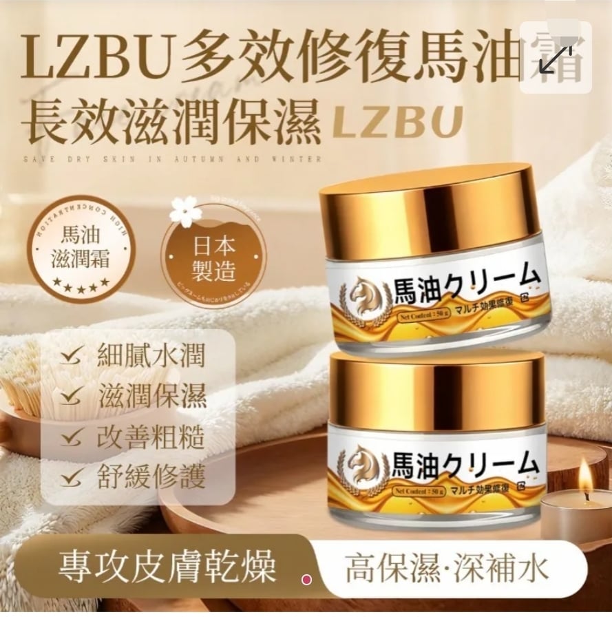 $55盒. 2盒起$45盒 . LZBU 多效修復馬油霜 50g ⛔截單日期:2025/12/17 06:00PM 📦預計貨到日: 2月中 深層滋養 × 多重修護 × 柔嫩光澤肌 重啟肌膚修復能量,綻放潤澤健康光采。 【LZBU 多效修復馬油霜】嚴選高純度日本馬油精華,結合多重保濕與修護植萃,深層滲透、全面修復,讓乾燥、粗糙、暗沉肌膚重回細緻柔亮的完美狀態。💧 💎 產品特色 🐎 高濃度馬油精華 —— 深層修護乾燥肌膚,改善粗糙與細紋。 🌿 多重植萃成分 —— 溫和潤養,強化肌膚屏障,恢復柔軟彈性。 💧 長效保濕鎖水 —— 一抹形成水潤保護膜,持久維持水嫩。 ✨ 輕盈不黏膩質地 —— 快速吸收、柔滑親膚,清爽不厚重。 🛡️ 全膚質適用 —— 特別適合乾燥、敏弱、脫皮肌膚使用。 🇯🇵 日本製造 —— 精研修護科技 × 高品質安心呵護。 📦 商品資訊 🧴 容量:50g/瓶 100入/箱 📅 有效日期:2028/10/14 🌍 產地:日本 🇯🇵 💆♀️ 使用方式 每日早晚取適量,均勻塗抹於臉部與頸部,輕輕按摩至吸收。乾燥季節可厚敷於重點部位,加強保濕修護。 💖 LZBU 多效修復馬油霜 潤澤、修護、緊緻一次完成, 讓肌膚回歸柔嫩細緻,重現自然光采。🌸✨ ==⚠️ 聲明 ⚠️== 1.本貨品為平行進口正貨。 2.所有帖文內容只作分享及參考用途。為免混淆視聽,所有商標或版權均屬有關商品品牌商標的持有人,敬請留意。 3.空運/海運有可能因各種不明因素影響而延誤到貨,所有貨品一經訂購後,如非廠家缺貨,不設取消/退貨/換貨。 4.貨品在運輸途中導致產品包裝外盒有任何損毀凹陷,但不影響其產品本身食用/使用,或有機會不預設外盒出貨,我司不會作任何更換或退款。 5.以上資料及外盒包裝只供參考,商品外盒原廠有更換新包裝權利,一切以實物為準。 6.顏色或因拍攝器材或顯示螢幕等因素而與實物有異,以上圖片及文字僅供參考,一切以實物為準。