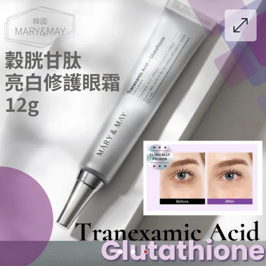 $55組2支。 2組起$45組 。 韓國MARY&MAY 穀胱甘肽亮白修護眼霜12g-1組2條 ⛔截單日期:2025/11/17 06:00PM 📦預計貨到日: 2026年1月中 ✨✨從「黯淡無光」到「閃亮動人」 🤩一條重啟眼周光采!💎韓國MARY&MAY 穀胱甘肽亮白修護眼霜12g【一組2條】 「🤩讓你的雙眸,重新綻放光彩✨」 💖煥亮眼周、💖擊退暗沉、💖撫平疲憊跡象 專為易出現黑眼圈、膚色不均、細紋初現的眼周設計🎯 💎韓國 MARY&MAY 穀胱甘肽亮白修護眼霜 用科技植萃成分🌿,讓眼周肌膚從「累」變「亮」,從「黯」變「盈」! 🌟亮白暗沉:富含傳明酸(Tranexamic Acid)與穀胱甘肽(Glutathione) 能有效淡化黑眼圈、修護膠原、改善眼周疲憊黯沉 🌟修護疲憊肌膚:搭配煙醯胺(Niacinamide)、維他命 C、腺苷(Adenosine)等 強化眼周肌膚屏障、提升彈力,撫平細紋 🌟深度保濕、潤澤光采:含有玻尿酸類(Sodium Hyaluronate)、泛醇(Panthenol)等潤澤成分 讓眼周肌膚一整夜柔嫩潤滑 🔹傳明酸 (Tranexamic Acid):高濃度導入,針對色素沉澱與黑眼圈調理,讓眼周膚色更均勻 🔹穀胱甘肽 (Glutathione):強效抗氧化,保護細胞免受環境壓力傷害,同時提升亮度 🔹煙醯胺 (Niacinamide):多效亮白、修護肌膚屏障、改善細紋與鬆弛 🔹維他命 C (Ascorbic Acid):協助淡化色斑、提升膠原蛋白生成,讓肌膚回復年輕光采 🔹玻尿酸 (Sodium Hyaluronate)+泛醇 (Panthenol):給予眼周肌膚深層潤澤,提升肌膚柔軟度與彈性 ✅ 使用建議 ▸早晚於清潔、化妝水後取適量輕點於眼周,下眼瞼及眉骨位置皆可 ▸以無名指由內向外輕輕按摩/拍打至吸收 ▸持續使用,可見眼周膚色更均勻、倦容更淡、細紋更柔 💡 為什麼值得擁有? 韓國熱銷款🔥,專為眼周「暗沉 + 細紋 +乾燥」設計 萃取多重亮白修護成分,真正從根源提升眼周膚質 質地潤澤但不厚重,適合日夜護理🆗 適合想要改善黑眼圈、提亮眼周膚色、回復年輕神采的人使用 規格:12g 產地:韓國 效期:2028.05 ==⚠️ 聲明 ⚠️== 1.本貨品為平行進口正貨。 2.所有帖文內容只作分享及參考用途。為免混淆視聽,所有商標或版權均屬有關商品品牌商標的持有人,敬請留意。 3.空運/海運有可能因各種不明因素影響而延誤到貨,所有貨品一經訂購後,如非廠家缺貨,不設取消/退貨/換貨。 4.貨品在運輸途中導致產品包裝外盒有任何損毀凹陷,但不影響其產品本身食用/使用,或有機會不預設外盒出貨,我司不會作任何更換或退款。 5.以上資料及外盒包裝只供參考,商品外盒原廠有更換新包裝權利,一切以實物為準。 6.顏色或因拍攝器材或顯示螢幕等因素而與實物有異,以上圖片及文字僅供參考,一切以實物為準。