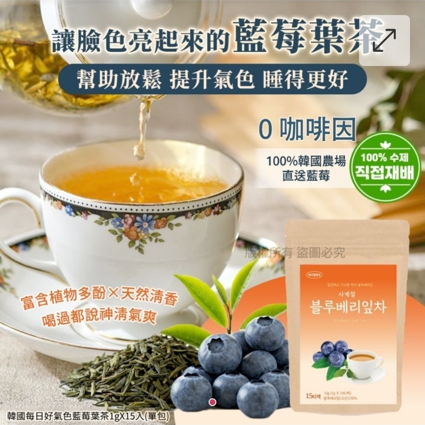 $55袋. 2袋或以上:$45袋. 韓國每日好氣色藍莓葉茶 (1袋15包) ⛔截單日期:2025/12/28 06:00PM 📦預計貨到日:3月頭 💤 睡前也能安心喝的氣色系茶飲 🍃 無咖啡因 × 清爽不苦 × 每天一杯超舒服 ✨ 使用 100% 藍莓葉 製成不加糖、不加香料 喝起來清爽溫和、完全不苦不澀 就算是「不太敢喝茶的人」也會一喝就愛上💕 ✔ 幫助循環氣色更好看 每天一杯讓身體慢慢暖起來臉色看起來更有精神✨ ✔ 無咖啡因睡前也能喝 不怕影響睡眠晚上泡一杯超放鬆超適合當晚安茶🌙 ✔ 清爽順口不苦不澀 淡淡草本香氣冷泡熱泡都好喝完全沒負擔! ☕ 沖泡方式: 熱泡:90°C 熱水沖泡 3~5 分鐘 冷泡:放入冷水冷藏 2~3 小時即可飲用 💗 推薦: ✔ 想提升氣色的人 ✔ 容易手腳冰冷、想喝溫和茶飲的人 ✔ 想戒含糖飲料的人 ✔ 睡前想放鬆、但不敢喝茶的人 -規格:1袋15包,每包1g -產地:韓國 ==⚠️ 聲明 ⚠️== 1.本貨品為平行進口正貨。 2.所有帖文內容只作分享及參考用途。為免混淆視聽,所有商標或版權均屬有關商品品牌商標的持有人,敬請留意。 3.空運/海運有可能因各種不明因素影響而延誤到貨,所有貨品一經訂購後,如非廠家缺貨,不設取消/退貨/換貨。 4.貨品在運輸途中導致產品包裝外盒有任何損毀凹陷,但不影響其產品本身食用/使用,或有機會不預設外盒出貨,我司不會作任何更換或退款。 5.以上資料及外盒包裝只供參考,商品外盒原廠有更換新包裝權利,一切以實物為準。 6.顏色或因拍攝器材或顯示螢幕等因素而與實物有異,以上圖片及文字僅供參考,一切以實物為準。