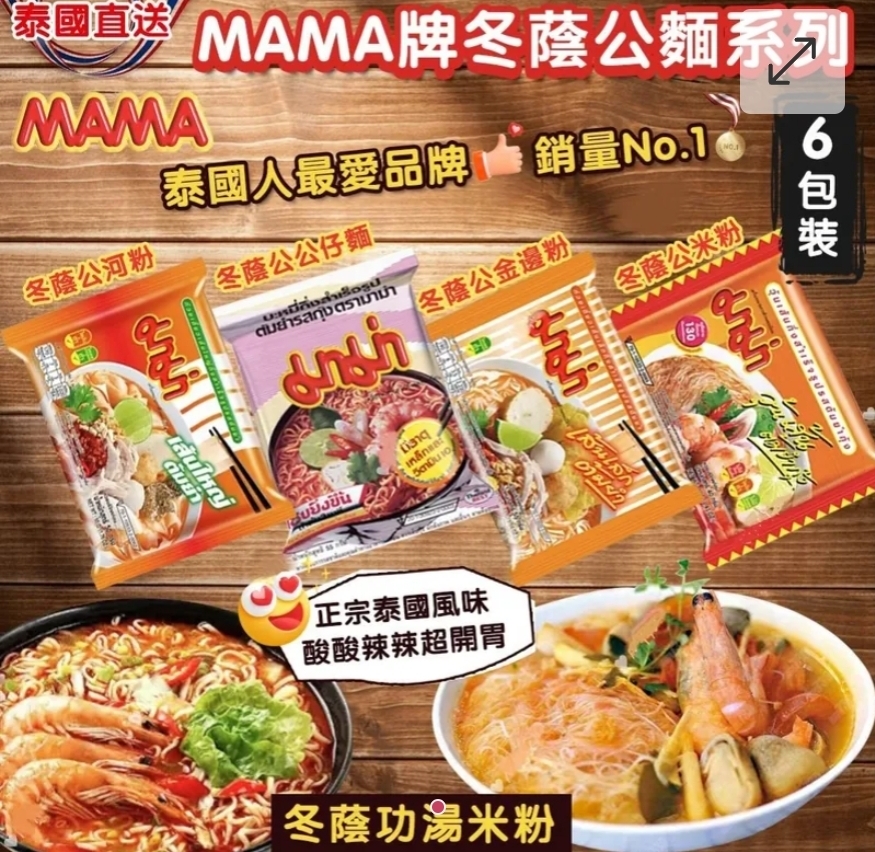 $55pack。 2pack 起$40pack 。 泰國直送-MAMA牌冬蔭公麵系列 ⛔截單日期:2025/12/16 06:00PM 📦預計貨到日: 2月中 A. 冬蔭公河粉 (50g x6包) B. 冬蔭公公仔麵 (55g x10包) C. 冬蔭公金邊粉 (55g x6包) D. 冬蔭公米粉 (40g x 6包) ⭐️泰國人最愛即食麵品牌⭐️ ⭐️全泰銷量No.1⭐️ 🤤正宗泰國風味 🤤酸酸甜甜辣辣超開胃 😍泰國經典美食,讓人一試難忘😍冬陰功麵的奇妙魅力🤤🤤🤤🤤🤤 冬陰功是泰國最具代表性的湯品之一,它以辣椒、檸檬葉、香茅和生薑等香料為基礎,形成了獨特的口味組合。 其特點是辣中帶酸,能夠在一口湯中帶給你多層次的味覺享受。 而冬陰功麵則是將這道湯品的精髓和麵條相結合,為你帶來絕妙的飲食體驗。 ==⚠️ 聲明 ⚠️== 1.本貨品為平行進口正貨。 2.所有帖文內容只作分享及參考用途。為免混淆視聽,所有商標或版權均屬有關商品品牌商標的持有人,敬請留意。 3.空運/海運有可能因各種不明因素影響而延誤到貨,所有貨品一經訂購後,如非廠家缺貨,不設取消/退貨/換貨。 4.貨品在運輸途中導致產品包裝外盒有任何損毀凹陷,但不影響其產品本身食用/使用,或有機會不預設外盒出貨,我司不會作任何更換或退款。 5.以上資料及外盒包裝只供參考,商品外盒原廠有更換新包裝權利,一切以實物為準。 6.顏色或因拍攝器材或顯示螢幕等因素而與實物有異,以上圖片及文字僅供參考,一切以實物為準。