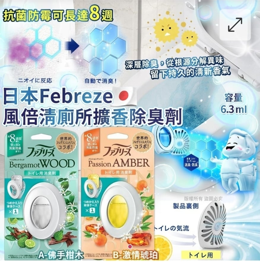 $58個. 2個或以上$48個. 日本Febreze 風倍清廁所擴香除臭劑6.3ml ⛔截單日期:2025/10/16 06:00PM 📦預計貨到日:12月頭 A-佛手柑木(綠) B-激情琥珀(橙) 日#Febreze風倍清 #廁所除臭神器 #唔係掩蓋係真除臭 香港家庭🏠廁所真係好多都細細間🙃,有時洗完手、沖完廁嗰陣, 陣味一爆出嚟🤧真係會「攻鼻」! 而家唔洗再靠噴香氣掩蓋味道🙅🏻♀ 呢款💥風倍清廁所擴香除臭劑💥—真係幫你主動消臭⚔ 🌬利用空氣流動自動釋出除臭成分 喺牆身同天花形成一層「防臭塗層🛡」 一有異味出現😈,即刻啟動🦾除臭反應💨 唔洗插電、唔洗噴、唔洗換電💡 💪🏻長效達8星期,日日都香香淨淨~ 💚佛手柑木——淡淡的苦味和甜味,令人平靜的香味 🧡激情琥珀——清新優雅的甜美香氣 🤲🏻使用方法🤲🏻 從包裝中取出產品,用兩個拇指用力按下背面的淺藍色按鈕,液體會釋放。 當香味變淡可再次按壓按鈕。 ❗注意事項❗ 🔘防臭塗層不能在磁磚等不吸收異味的材料表面形成。 ▪容量:6.3ml ==⚠️ 聲明 ⚠️== 1.本貨品為平行進口正貨。 2.所有帖文內容只作分享及參考用途。為免混淆視聽,所有商標或版權均屬有關商品品牌商標的持有人,敬請留意。 3.空運/海運有可能因各種不明因素影響而延誤到貨,所有貨品一經訂購後,如非廠家缺貨,不設取消/退貨/換貨。 4.貨品在運輸途中導致產品包裝外盒有任何損毀凹陷,但不影響其產品本身食用/使用,或有機會不預設外盒出貨,我司不會作任何更換或退款。 5.以上資料及外盒包裝只供參考,商品外盒原廠有更換新包裝權利,一切以實物為準。 6.顏色或因拍攝器材或顯示螢幕等因素而與實物有異,以上圖片及文字僅供參考,一切以實物為準。