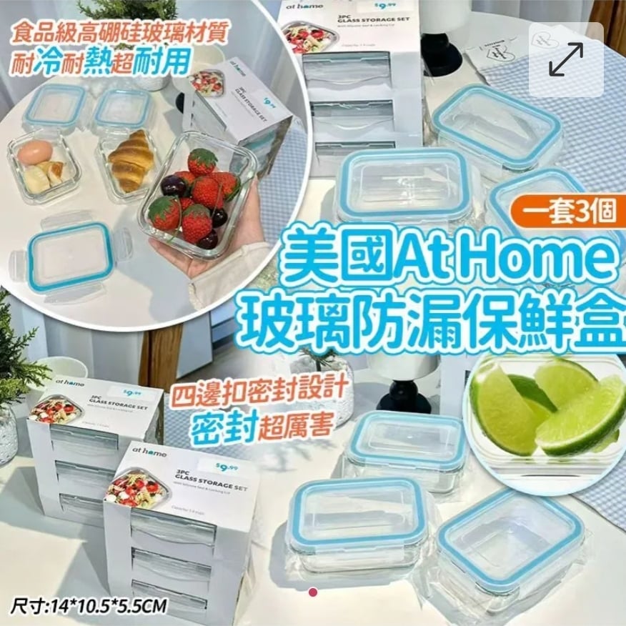 $58套。 2套或以上每套$48套。 美國At Home玻璃防漏保鮮盒(一套3個) ⛔截單日期:2025/11/11 06:00PM 📦預計貨到日:2026年1月尾 🌈高硼硅玻璃保鮮盒三件套 生活的精緻藏在細節裏~🌼 食品級高硼硅玻璃材質✨耐冷耐熱超耐用,從冰箱到微波爐都能輕鬆駕馭。 🙉四邊扣密封設計,密封超厲害,放冰箱保鮮不串味,水果、穀物、飯菜都能妥善收納,精緻生活從擁有它開始~ ✅尺寸:14*10.5*5.5CM(單個尺寸) 💥一套3個 ==⚠️ 聲明 ⚠️== 1.本貨品為平行進口正貨。 2.所有帖文內容只作分享及參考用途。為免混淆視聽,所有商標或版權均屬有關商品品牌商標的持有人,敬請留意。 3.空運/海運有可能因各種不明因素影響而延誤到貨,所有貨品一經訂購後,如非廠家缺貨,不設取消/退貨/換貨。 4.貨品在運輸途中導致產品包裝外盒有任何損毀凹陷,但不影響其產品本身食用/使用,或有機會不預設外盒出貨,我司不會作任何更換或退款。 5.以上資料及外盒包裝只供參考,商品外盒原廠有更換新包裝權利,一切以實物為準。 6.顏色或因拍攝器材或顯示螢幕等因素而與實物有異,以上圖片及文字僅供參考,一切以實物為準。