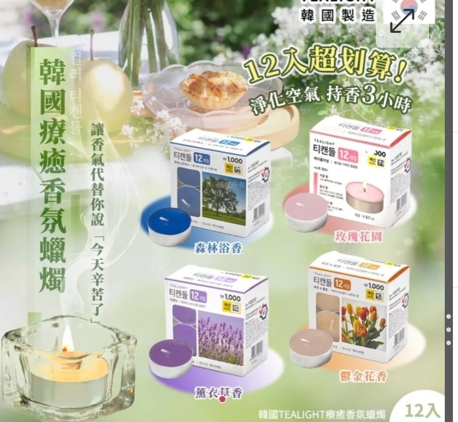 $58套12入 . 韓國Tealight療癒香氛蠟燭12入-1套4盒每味各一 ⛔截單日期:2025/11/26 06:00PM 📦預計貨到日: 2026年1月中 🕯 每支都帶著柔和香氣 讓房間瞬間變得溫暖又放鬆💆♀️ 上班回家、泡澡時、睡前點一支~ 香氣圍繞的那一刻真的超療癒🌿 💐 擺在桌上也好看! 不論客廳、臥室、浴室都能用 韓妞都愛用的小香氛💖 💙森林浴香(藍) 💗玫瑰花園(粉) 💜薰衣草香(紫) 🧡鬱金香花(橘) 🎁 想送禮也超有誠意~ 一次買一包,香氣滿屋整個月✨ 👇 現在入手剛剛好👇 💰超值12入/療癒香氣 × 溫暖氛圍 × 高顏值佈置感 *預計燃燒時間: 每顆約2-3小時 韓國Tealight療癒香氛蠟燭12入(1套4盒,每味各一) 01 森林浴香(藍) 02 鬱金香花(橘) 03 玫瑰花園(粉) 04 薰衣草香(紫) *韓國造製 ==⚠️ 聲明 ⚠️== 1.本貨品為平行進口正貨。 2.所有帖文內容只作分享及參考用途。為免混淆視聽,所有商標或版權均屬有關商品品牌商標的持有人,敬請留意。 3.空運/海運有可能因各種不明因素影響而延誤到貨,所有貨品一經訂購後,如非廠家缺貨,不設取消/退貨/換貨。 4.貨品在運輸途中導致產品包裝外盒有任何損毀凹陷,但不影響其產品本身食用/使用,或有機會不預設外盒出貨,我司不會作任何更換或退款。 5.以上資料及外盒包裝只供參考,商品外盒原廠有更換新包裝權利,一切以實物為準。 6.顏色或因拍攝器材或顯示螢幕等因素而與實物有異,以上圖片及文字僅供參考,一切以實物為準。
