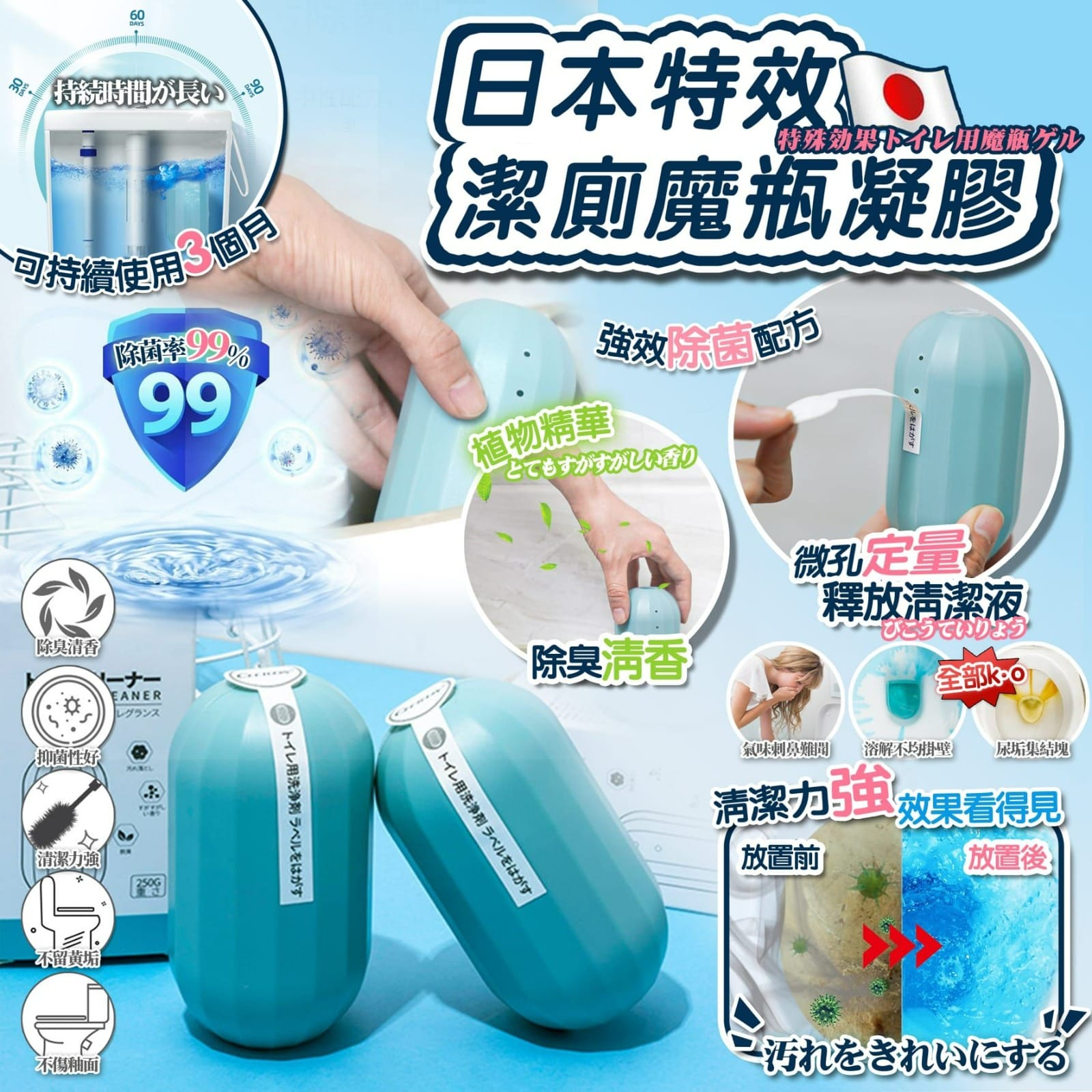 $58套3入。2套或以上$48套, 日本🇯🇵特效潔廁魔瓶凝膠(一套3個) ✈️下單後約12月初到貨 日本🇯🇵特效潔廁魔瓶凝膠(一套3個) Wow 原價$99/個😱 限時特價最平/個👏👏 一瓶凝膠等於80粒藍泡泡,除菌99.9%,氣味清香 👍👍 超級經濟實惠❗ 清潔馬桶仲用緊藍泡泡?No Way☹️依家已經出咗第3代魔瓶凝膠了‼️ 最新高效潔廁黃金配方🥰 不需要天天刷馬桶🚽👆放一樽就搞定👏 風魔日本的魔瓶凝膠絕對係媽媽的好幫手‼️ 一瓶魔瓶凝膠可持續使用3個月,持續時間長,唔使成日打開廁所蓋添加,省時省力 4大特點: ✅清潔去垢 ✅去除異味 ✅保養馬桶 ✅持續使用 使用方法: 1.撕開側面貼紙 2.取掉頂部瓶塞 3.打開馬桶水箱蓋 4.慢慢放入水箱,等待5-10分鐘後使用 顏色︰綠色 容量︰250g(可持續使用3個月)