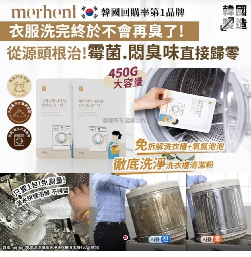 韓國merhent氧氣泡泡徹底洗淨洗衣槽清潔粉450g(1套4包)