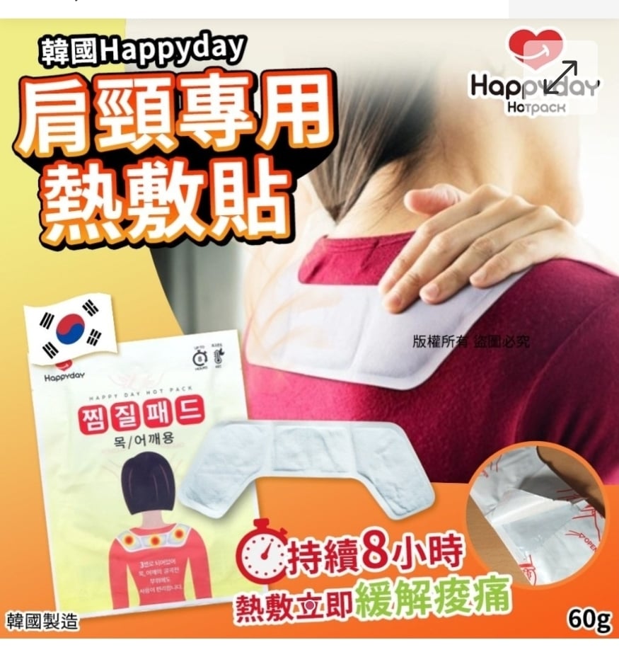 $58套5包. 2套或以上:$48套. 韓國 Happyday 肩頸專用熱敷貼 60g (1套5包) ⛔截單日期:2025/11/23 06:00PM 📦預計貨到日:2月頭 脖子肩頸是調控體溫的重要樞紐🫣 肩頸痠痛~來上一片熱敷貼 真的是太舒服啦~🥰持續8小時發熱🥰 尤其冬天經常跑戶外🍀釣魚、高爾夫、滑雪的人 🍀血液循環又比較差❗冬天很容易出狀況❗ 熱熱敷、暖暖的💖超快好❗還能紓壓❗ 或是偶爾感冒引起的腰酸背痛 關節痛,都可以用它來緩解❗ 🔻使用方法🔻 打開外包裝後,將裏面的暖貼 取出撕掉背面的膠捲 貼在衣服上面的肩部,自然地會發熱。 -規格︰1套5包,每包60g -產地︰韓國 ⚠注意事項⚠ 1. 打開包裝,約5分鐘後會開始發熱。 2. 請避免直接接觸皮膚。 3. 請勿敷著睡覺,低溫燙傷的風險很高。 ==⚠️ 聲明 ⚠️== 1.本貨品為平行進口正貨。 2.所有帖文內容只作分享及參考用途。為免混淆視聽,所有商標或版權均屬有關商品品牌商標的持有人,敬請留意。 3.空運/海運有可能因各種不明因素影響而延誤到貨,所有貨品一經訂購後,如非廠家缺貨,不設取消/退貨/換貨。 4.貨品在運輸途中導致產品包裝外盒有任何損毀凹陷,但不影響其產品本身食用/使用,或有機會不預設外盒出貨,我司不會作任何更換或退款。 5.以上資料及外盒包裝只供參考,商品外盒原廠有更換新包裝權利,一切以實物為準。 6.顏色或因拍攝器材或顯示螢幕等因素而與實物有異,以上圖片及文字僅供參考,一切以實物為準。
