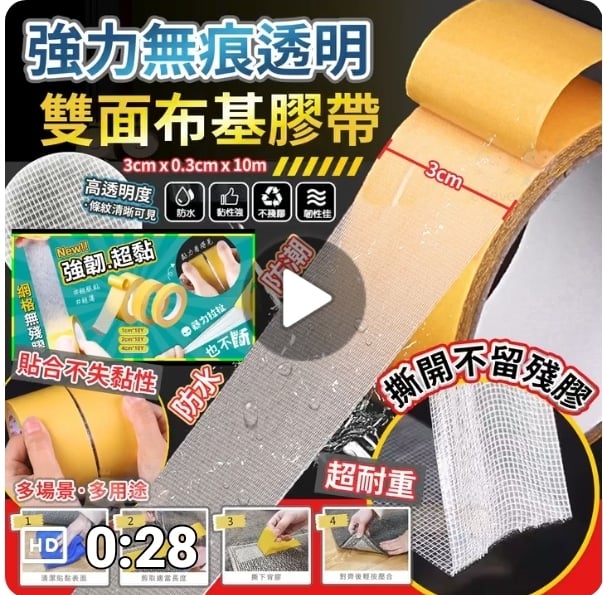 黏力特強👍🏻👍🏻反地心吸力😝😝超級牢固, 不留殘膠 $58套5卷。 強力無痕透明布基雙面膠(1套5卷) 超黏雙面布基膠帶專為解決家居煩惱而設計🥳 🉐新升級紗布纖維 🤟韌性佳 🤟黏性強 黏貼更牢固❗️ 撕下來無痕不留殘膠,想幾時轉位都🉐 貼合不失黏性 🤟撕下無痕 🤟乾淨不留殘膠💦 🤟臥室、客廳、廚房等多場景適用 超強勁既無痕透明雙面膠🔥,以後唔駛鑽牆🚫,輕輕鬆鬆可以將物件黏上牆👍,不受物料限制,瓷磚、金屬、木材、鋁鐵、膠...etc 通通冇問題,防水防潮,無論廁所、廚房使用都可以,撕下來無痕不留殘膠,想幾時轉位都得,10米超長可以任意剪裁✂手撕也OK✋ ✔️ 家居使用 - 掛勾、海報、相片牆、裝飾品、浴室杯架、 牙刷架、玩具 ✔️ 汽車內外黏貼, 外部飾條、防撞條、 油箱蓋、腳踏板內部導航儀、 香水盒等掛件均 適用 📏寬度3cm x 厚度 x 0.3mm x 長度 10m 📌適用於瓷磚、金屬、木材、鋁鐵、膠、任何物料上面 🉐承重力超高, 超耐重 🉐防水防潮 🉐具拉力及彈性 🉐撕下來無痕不留殘膠