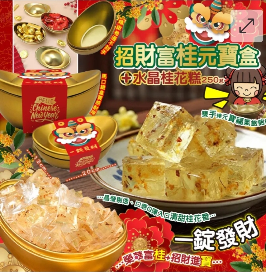 $58盒。 2個起每個48盒。 2026新年一錠富桂元寶盒 250g ⛔截單日期:2025/12/15 06:00PM 📦預計貨到日: 2月頭 🎉【新一年,財氣自己迎!】🎉 全新限量《富桂元寶盒》正式登場! 以「元寶」為靈感設計,象徵 招財進寶、好運滿載,送禮自用都超有面子✨ 💰 新年限時優惠|價格都有「發」嘅意思! 買畀自己開運、送禮都夠晒意頭,過年就係要咁旺咁好彩🔥 💛 手工水晶桂花糖 古法熬煮、慢火凝結,入口晶透脆香,伴隨淡淡桂花幽香。 甜而不膩、意頭滿滿,是過年必備的開運小甜品! 🧧 一錠發財腰封|一開盒就見好意頭! 每盒特製「一錠發財腰封」,寓意 財運隨手迎、好運一錠接一錠。 無論放喺公司枱頭、家中招福位,都充滿喜氣,象徵新一年順順利利、福氣滿滿! ✨為咩人人都搶? ✔ 造型討喜:元寶造型大吉大利 ✔ 意頭滿滿:桂花寓意「貴氣來臨」 ✔ 新年送禮一流:長輩、朋友、客戶都鍾意 ✔ 擺設級禮盒:拍照打卡超靚! 🧨 新年想要好運旺不停? ➡ 就係要揀《富桂元寶盒》! -產地:台灣 -規格:糖果250g -保存期限:生產日起計360天(銷售速度快,依廠商出貨日為主) ==⚠️ 聲明 ⚠️== 1.本貨品為平行進口正貨。 2.所有帖文內容只作分享及參考用途。為免混淆視聽,所有商標或版權均屬有關商品品牌商標的持有人,敬請留意。 3.空運/海運有可能因各種不明因素影響而延誤到貨,所有貨品一經訂購後,如非廠家缺貨,不設取消/退貨/換貨。 4.貨品在運輸途中導致產品包裝外盒有任何損毀凹陷,但不影響其產品本身食用/使用,或有機會不預設外盒出貨,我司不會作任何更換或退款。 5.以上資料及外盒包裝只供參考,商品外盒原廠有更換新包裝權利,一切以實物為準。 6.顏色或因拍攝器材或顯示螢幕等因素而與實物有異,以上圖片及文字僅供參考,一切以實物為準。