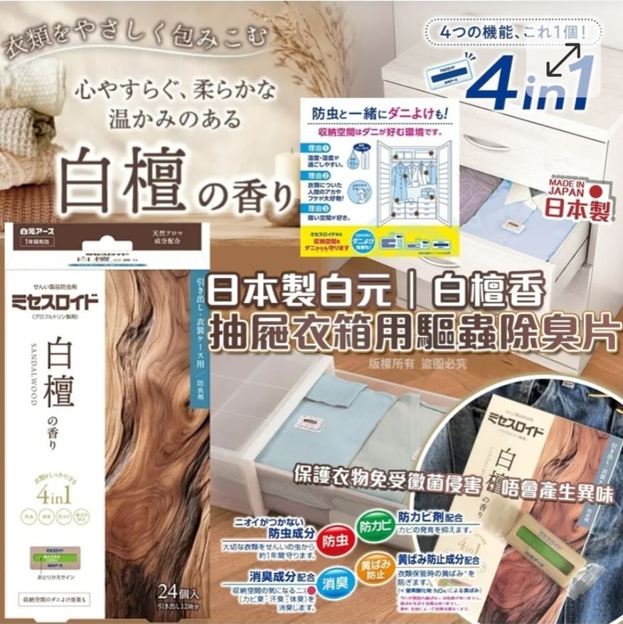 $58盒24入.2盒或以上$48盒.日本製白元-白檀香抽屜衣箱用驅蟲除臭片24入