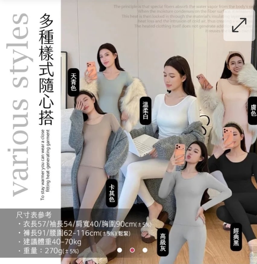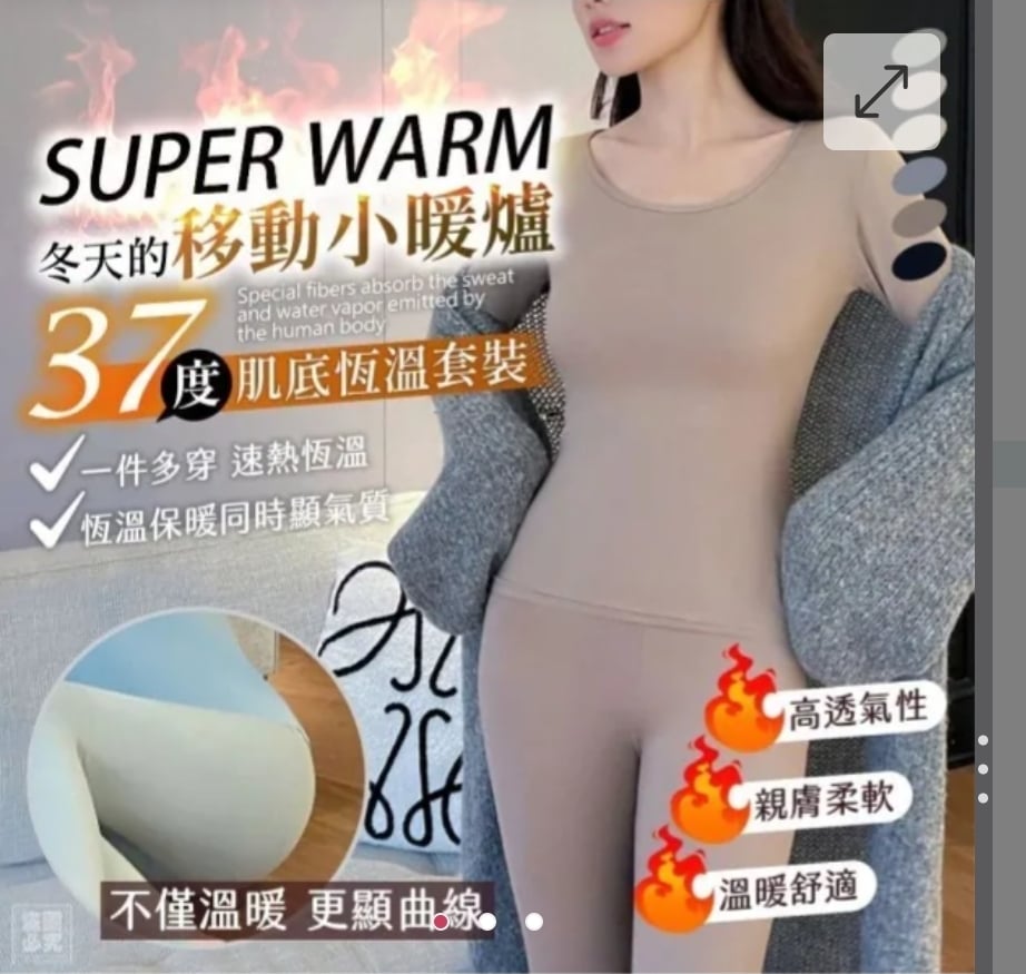 $59套. 2套起$50套. 37度肌底 恆溫保暖套裝 ⛔截單日期:2025/11/09 06:00PM 📦預計貨到日:2026年1月頭 💥冬天冷空氣即將來襲❄️ 體寒女孩都超值得入手的保暖套裝 🔥【37度肌底恆溫套裝】🔥 一穿上=瞬間化身「人形小火爐」🔥 從早到晚都暖呼呼,穿著舒服到捨不得脫💗 親膚貼身,彈力超大,胖瘦都能穿👌 保暖×顯瘦×百搭,一套搞定秋冬穿搭✨ 無論是居家、外出還是內搭都超實用💯 軟糯面料貼身不臃腫 💨💨輕薄卻保暖力MAX💨💨 穿上它,冬天的寒風也完全打不倒你💪 🉐️🉐️🉐️暖冬優惠價一套$159 🧸冷天必備神器🧸 一套上衣+長褲=速熱恆溫不臃腫✨ ✔️單穿氣質滿分 ✔️內搭羽絨服、毛衣都不卡身 ✔️還能當睡衣穿!柔軟得誇張! 💡這不是普通秋衣💡 它是「黑科技發熱+恆溫保暖」的神級打底 穿上有感升溫,整天暖呼呼💥 親膚又有彈性~ 從40-70公斤都能輕鬆駕馭👑 🌈這次的色系真的太!美!了!🌈 💫經典黑|💫溫柔白|💫卡其色| 💫高級灰|💫天青色|💫膚色| 穿起來酥軟貼身,像被雲朵抱住☁️ 不緊繃、不勒腰、彈性超大~ 連媽媽級都大讚「舒服又修身」👏 💗高彈力面料|輕薄鎖溫|細節精緻💗 溫暖卻不厚重,一整天自由伸展 ✨保暖同時還能修身顯瘦✨ 一套搞定秋冬所有造型, 外出、居家、通勤都能輕鬆切換💥 冬天不臃腫還能美出新高度💃 🔍產品資訊🔍 產地 : PRC (台灣監製) 重量 : 約270g(±5%) 建議體重 : 40-70kg 材質 : 88.2%聚酯纖維、11.8%氨綸 顏色:青/白/膚/卡其/灰/黑 (遇缺隨機) ==⚠️ 聲明 ⚠️== 1.本貨品為平行進口正貨。 2.所有帖文內容只作分享及參考用途。為免混淆視聽,所有商標或版權均屬有關商品品牌商標的持有人,敬請留意。 3.空運/海運有可能因各種不明因素影響而延誤到貨,所有貨品一經訂購後,如非廠家缺貨,不設取消/退貨/換貨。 4.貨品在運輸途中導致產品包裝外盒有任何損毀凹陷,但不影響其產品本身食用/使用,或有機會不預設外盒出貨,我司不會作任何更換或退款。 5.以上資料及外盒包裝只供參考,商品外盒原廠有更換新包裝權利,一切以實物為準。 6.顏色或因拍攝器材或顯示螢幕等因素而與實物有異,以上圖片及文字僅供參考,一切以實物為準。