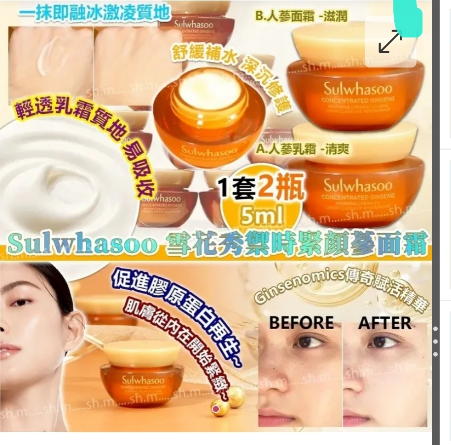 $60套2件。2套或以上$5O套。韓國 Sulwhasoo 雪花秀禦時緊顏蔘面霜5ml (1套2瓶)