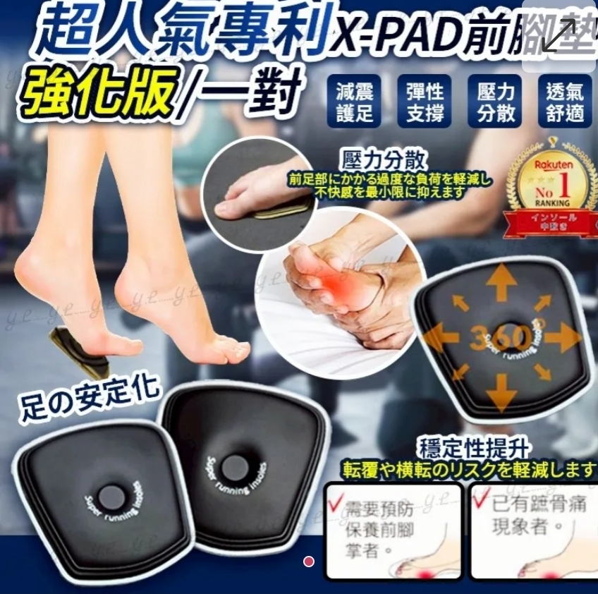 $60對. 2對或以上$50對. 超人氣專利X-PAD前腳墊 - 強化版 (一對) ⛔截單日期:2025/11/18 06:00PM 📦預計貨到日: 2026年1月中 長時間走路或站立、運動時常覺得前腳掌痠痛嗎? 這款 「X-PAD前腳墊強化版」 專為保護蹠骨設計,能有效分散壓力、減少前腳掌疼痛,讓你運動、出門都更舒適! 💡 為什麼需要前腳墊? ✔ 常見的蹠骨痛、蹠骨炎,多因走路或運動時壓力集中在前腳掌造成。 ✔ 沒有保護,長期下來容易引發腫痛、不適,甚至影響行走姿勢。 💡影片介紹: https://reurl.cc/RkVRae 🔥 前腳墊強化版 4大優點: 1️⃣ 穩定性提升:減少翻船、側翻風險。 2️⃣ 抓地力加強:起動、急停、橫向移動更有力。 3️⃣ 壓力分散:降低前腳掌過度負荷,減少不適感。 4️⃣ 舒適度改善:腳趾空間更充足,減少摩腳。 🌟 特點加分: ✅ 前掌墊面積加大 → 增加接觸面積,走起來更平穩! ✅ 360度氣流設計 → 穿鞋就像腳底按摩舒適。 ✅ 適用鞋款:運動鞋 / 休閒鞋 / 涼鞋,全都能搭! -產地:台灣 -規格:8×7.8cm+厚0.45cm ==⚠️ 聲明 ⚠️== 1.本貨品為平行進口正貨。 2.所有帖文內容只作分享及參考用途。為免混淆視聽,所有商標或版權均屬有關商品品牌商標的持有人,敬請留意。 3.空運/海運有可能因各種不明因素影響而延誤到貨,所有貨品一經訂購後,如非廠家缺貨,不設取消/退貨/換貨。 4.貨品在運輸途中導致產品包裝外盒有任何損毀凹陷,但不影響其產品本身食用/使用,或有機會不預設外盒出貨,我司不會作任何更換或退款。 5.以上資料及外盒包裝只供參考,商品外盒原廠有更換新包裝權利,一切以實物為準。 6.顏色或因拍攝器材或顯示螢幕等因素而與實物有異,以上圖片及文字僅供參考,一切以實物為準。