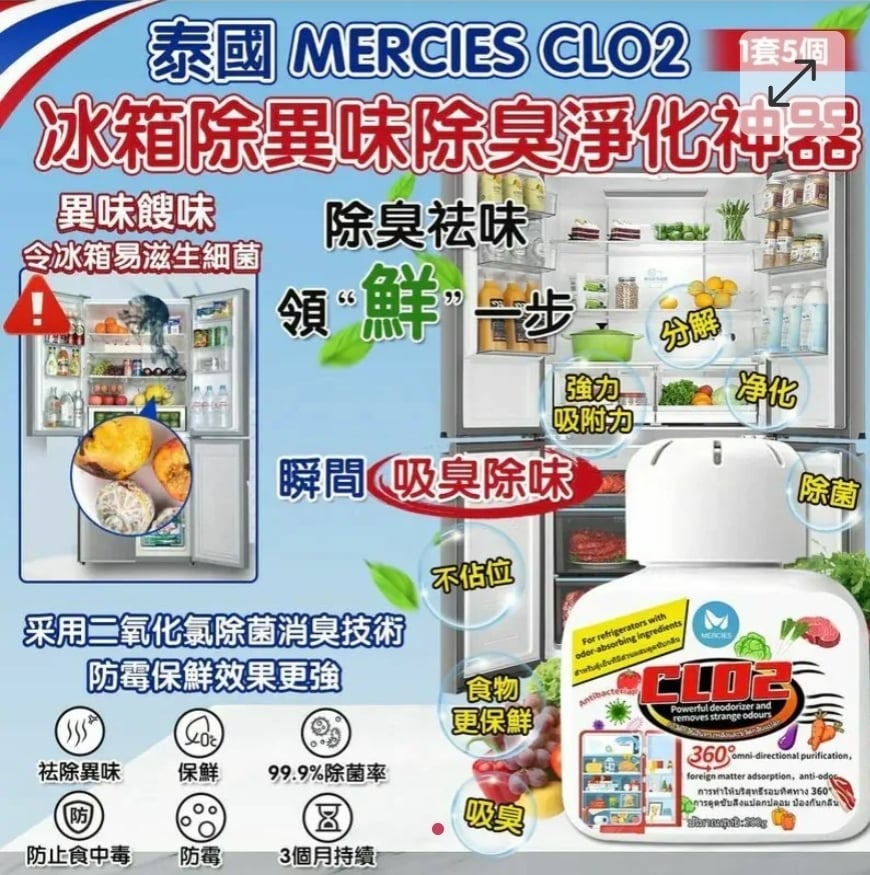 $65套. 2套以上$55套 . 泰國 MERCIES CLO2 冰箱除異味除臭淨化神器 200g (1套5個) ⛔截單日期:2025/11/27 06:00PM 📦預計貨到日:2026年1月中 推介推介👍🏻👍🏻 消臭芳香,讓冰箱香起來 抑菌殺菌率達99% 🌟勁減低至$12/個🌟 唔想一打開雪櫃🤭成陣味傳出黎🤮又魚又肉有時都真係幾腥🤮 推薦呢個冰箱除臭殺菌淨化神器, 不單可以除臭殺菌,仲可以延長食物保鮮期,真係超級抵呀‼️ ✔️有效破壞農藥殘留🥶 防止食物中毒 ✔️採用二氧化氯除菌消臭技術,活性氧抑制細菌滋生,預防細菌超標🤢99.9% 防菌 ✔️保鮮並且消除冰箱異味😙 ✔️防止潮濕發霉💦 ✔️延長保鮮期短🍇🍎🍏 ==⚠️ 聲明 ⚠️== 1.本貨品為平行進口正貨。 2.所有帖文內容只作分享及參考用途。為免混淆視聽,所有商標或版權均屬有關商品品牌商標的持有人,敬請留意。 3.空運/海運有可能因各種不明因素影響而延誤到貨,所有貨品一經訂購後,如非廠家缺貨,不設取消/退貨/換貨。 4.貨品在運輸途中導致產品包裝外盒有任何損毀凹陷,但不影響其產品本身食用/使用,或有機會不預設外盒出貨,我司不會作任何更換或退款。 5.以上資料及外盒包裝只供參考,商品外盒原廠有更換新包裝權利,一切以實物為準。 6.顏色或因拍攝器材或顯示螢幕等因素而與實物有異,以上圖片及文字僅供參考,一切以實物為準。