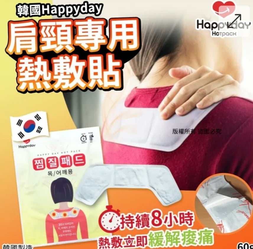 $65套. 2套起$55套. 韓國Happyday肩頸專用熱敷貼60g(1套10包) ⛔截單日期:2025/11/10 06:00PM 📦預計貨到日:2026年1月頭 脖子肩頸是調控體溫的重要樞紐 肩頸痠痛~來上一片熱敷貼 真的是太舒服啦~持續8小時發熱 🍀 尤其冬天經常跑戶外 釣魚、高爾夫、滑雪的人。 🍀 血液循環又比較差! 冬天很容易出狀況! 💖 熱熱敷、暖暖的超快好!還能紓壓! 或是偶爾感冒 / MC來引起的腰酸背痛 關節痛,都可以用它來緩解! 🔴 使用方法: 打開外包裝後,將裏面的暖貼 取出撕掉背面的膠捲 貼在衣服上面的肩部,自然地會發熱。 🔴 注意事項: 1. 打開包裝,約5分鐘後會開始發熱。 2. 請避免直接接觸皮膚。 3. 請勿敷著睡覺,低溫燙傷的風險很高。 4. *韓國製造 ==⚠️ 聲明 ⚠️== 1.本貨品為平行進口正貨。 2.所有帖文內容只作分享及參考用途。為免混淆視聽,所有商標或版權均屬有關商品品牌商標的持有人,敬請留意。 3.空運/海運有可能因各種不明因素影響而延誤到貨,所有貨品一經訂購後,如非廠家缺貨,不設取消/退貨/換貨。 4.貨品在運輸途中導致產品包裝外盒有任何損毀凹陷,但不影響其產品本身食用/使用,或有機會不預設外盒出貨,我司不會作任何更換或退款。 5.以上資料及外盒包裝只供參考,商品外盒原廠有更換新包裝權利,一切以實物為準。 6.顏色或因拍攝器材或顯示螢幕等因素而與實物有異,以上圖片及文字僅供參考,一切以實物為準。