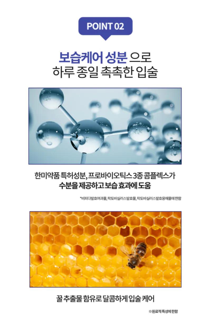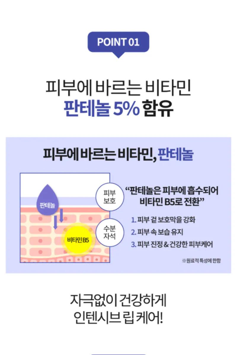 深層修護 蘊含5%高濃度泛醇(維生素B5前驅物),能深層滋潤和修護乾燥、脫皮的嘴唇,有助於強化唇部屏障。