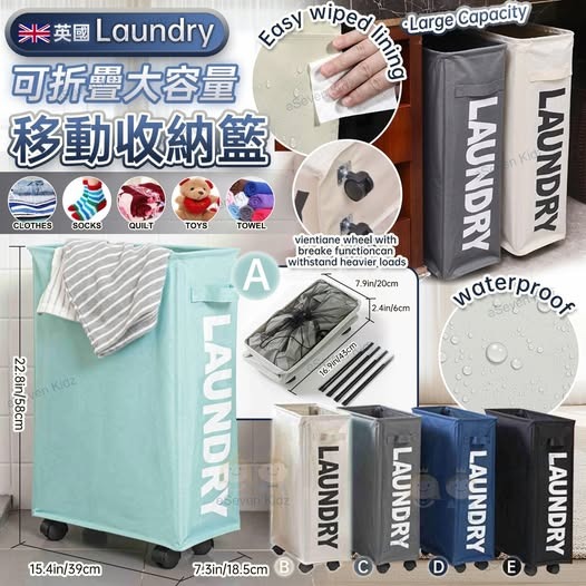 收納好幫手🙌,大容量又可移動🦾 放衣服, 玩具, 什物整潔又方便🉐🉐 $65組2件。 英式🇬🇧LAUNDRY 可折疊大容量可移動收納籃(配滑輪),🌟 🌈5色可選: 湖水綠/ 米白色/ 灰色 / 深藍色 / 黑色 💕英國熱賣收納藍, 👍窄身設計,慳地方, 適用於BB房、大學宿舍、托兒所、洗衣房等。 大容量 🌟🌟🌟,一家人嘅污衣都放得落,就算係🧸玩具, 📚雜誌, 什物都能輕鬆裝下 🧺 底部配備順滑輪子,輕輕一推就能自由移動🚶♀️,臥室、浴室、客廳隨意穿梭,毫無卡頓感,日常挪動輕鬆不費力 💨, 可摺叠式設計,不使用時可輕鬆折疊,易於收納 而且結實耐用💪,抗皺又耐磨,能夠承受滿滿一筐衣物的重量,不易變形損壞。 除了放衣服,它還是一個多功能收納筐 🏠。放在客廳,能收納孩子散落一地的玩具 🧸;放在書房,可用來裝書報雜誌 📚。 有車一族放在汽車後備箱 🚗,收納洗車用品、應急工具🔧等,讓車尾箱告別雜亂 📐尺寸: 58x39x18.5cm 中國製造
