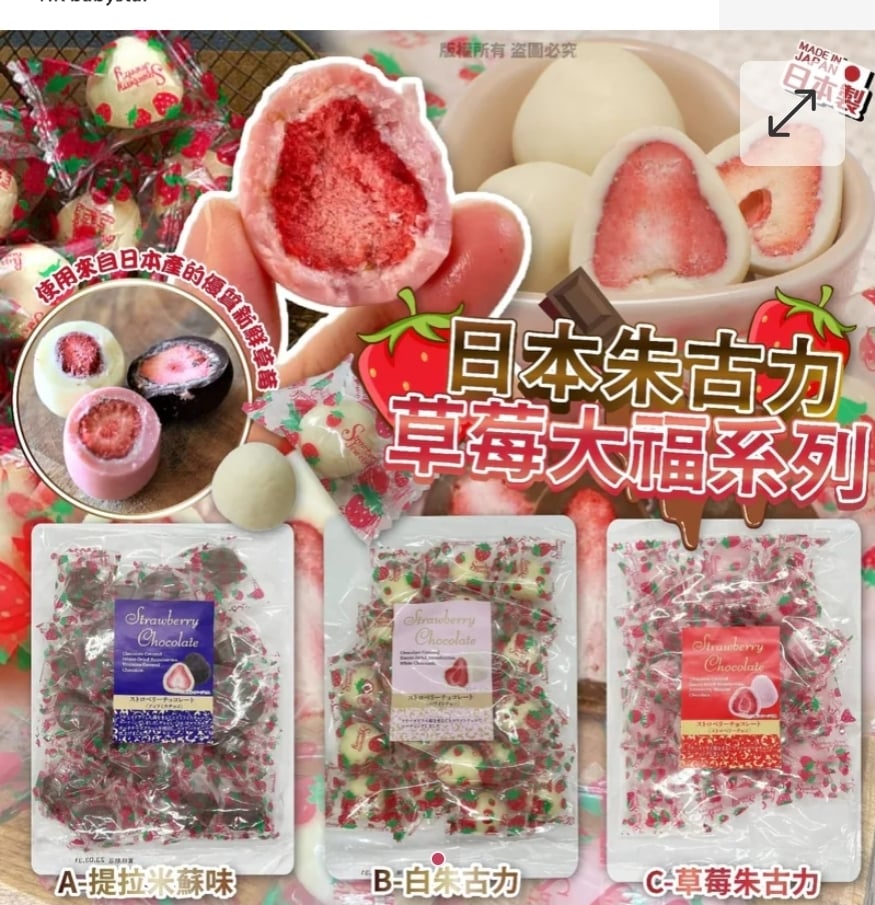 $68包. 2包或以上$58包. 日本朱古力草莓大福系列 ⛔截單日期:2025/11/19 06:00PM 📦預計貨到日: 2026年1月尾 一年一度🎤🎤草莓控留意~~新年放全盒😍必食‼‼朱古力🍫 X 原粒草莓🍓 ❄冬季限定~~賣晒要等下年🙊 每年到草莓季節🍓,不可以唔食嘅日式甜點,必定係草莓大福😘 原粒草莓🍓,裹上濃郁朱古力醬🍫 酸甜滋味😋一試難忘 獨立包裝🍬,一開即食 原粒草莓乾🍓 + 款朱古力口味🍫,沈浸香甜幸福🥰 ✨提拉米蘇味(黑)——甜酸 mix 苦澀,完美平衡 ✨白朱古力(白)——濃郁香甜的極致 ✨草莓朱古力(粉紅)——雙倍草莓的幸福 款口味一次過擁有,慢慢享受🤤 ▪原產地:日本製造 ▪有效期:出廠日計240天 ==⚠️ 聲明 ⚠️== 1.本貨品為平行進口正貨。 2.所有帖文內容只作分享及參考用途。為免混淆視聽,所有商標或版權均屬有關商品品牌商標的持有人,敬請留意。 3.空運/海運有可能因各種不明因素影響而延誤到貨,所有貨品一經訂購後,如非廠家缺貨,不設取消/退貨/換貨。 4.貨品在運輸途中導致產品包裝外盒有任何損毀凹陷,但不影響其產品本身食用/使用,或有機會不預設外盒出貨,我司不會作任何更換或退款。 5.以上資料及外盒包裝只供參考,商品外盒原廠有更換新包裝權利,一切以實物為準。 6.顏色或因拍攝器材或顯示螢幕等因素而與實物有異,以上圖片及文字僅供參考,一切以實物為準。