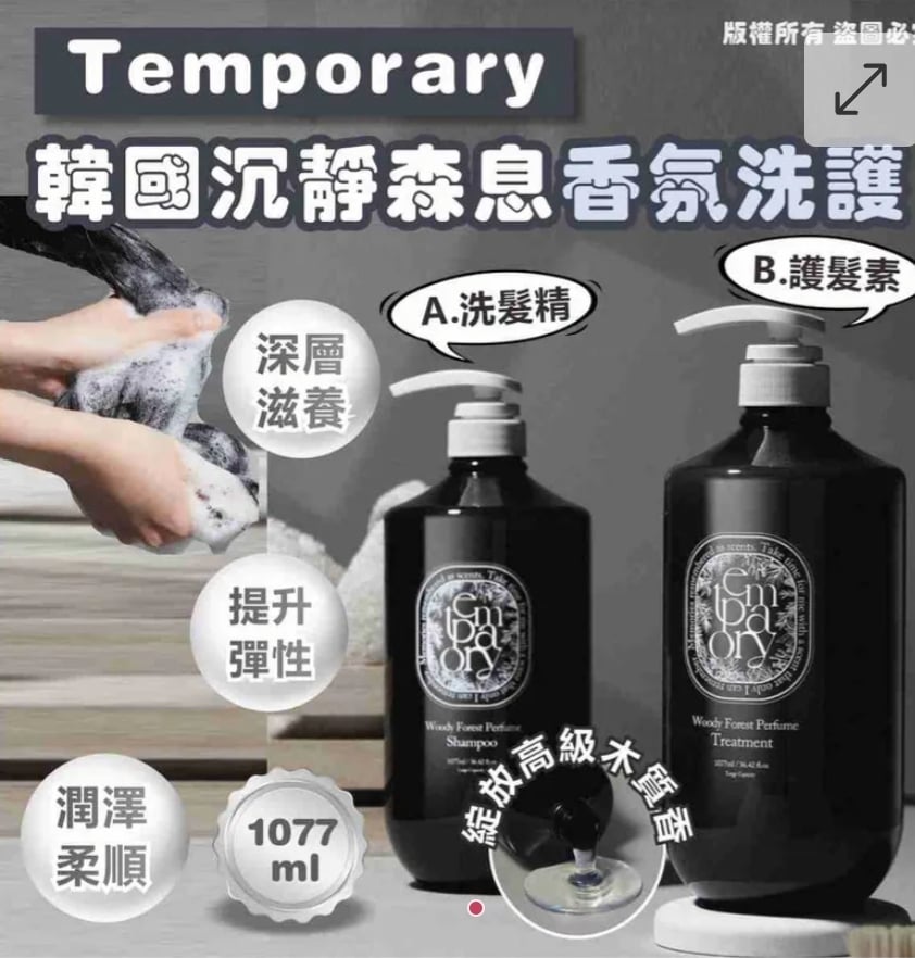 $68支.2支或以上:$58支.韓國製造 Temporary 沉靜森息香氛洗護系列 1077ml