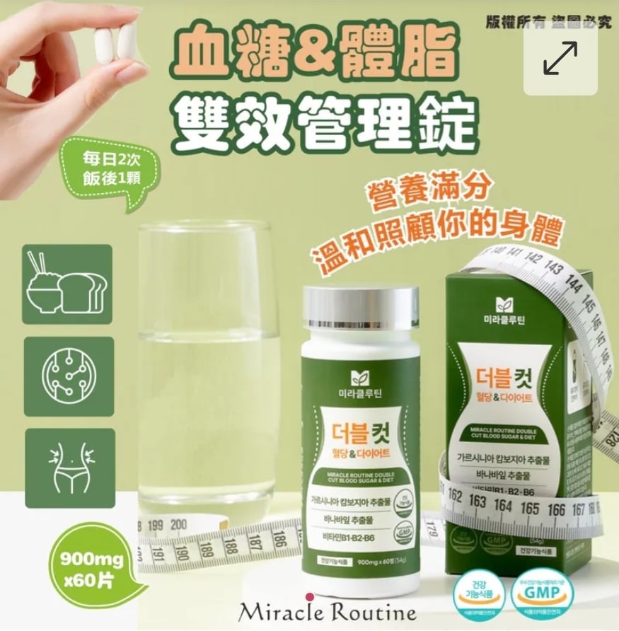 $68樽. 2樽或以上:$58樽. 韓國 Miracle Routine 血糖&體脂雙效管理錠 (1樽60粒) ⛔截單日期:2025/12/22 06:00PM 📦預計貨到日:2月尾 🔥 你的「雙效奇蹟」終於來了!🔥 一天兩粒,輕鬆開啟健康儀式感 💊💫 🌟 雙重核心,雙倍守護 🌟 👉 飯後血糖飆升好困擾? 【巴拿巴葉提取物】助你抑制飯後血糖上升,安心享受每一餐 🍚➡️📉 👉 碳水總是變脂肪? 【藤黃果提取物 HCA】阻斷碳水轉化脂肪,助攻體脂減少 ⚖️➡️🔥 💪 更有維生素B群能量助攻: B1+B2+B6 加滿200%每日所需,激活代謝,整天活力滿滿 ⚡💥 🌿 5種天然副原料精心配比: 綠茶、蘆薈、27種水果酵素、仙人掌、朝鮮薊… 營養滿分,溫和照顧你的身體 🌱🍍 🏭 GMP認證廠嚴格製造,品質安心有保障 ✅ 📈 真人實驗實證支持,效果看得見 📊 🎯 適合這樣的你: ✔️ 體重難控制、易堆積體脂 ✔️ 飲食不規律、身材走樣 ✔️ 想健康管理、雙效兼顧 🚨 貼心提醒: 每日2次、飯後1粒,搭配充足水分 💦 均衡飲食+適當運動,效果更加乘 🏃♀️🍎 -規格 : 1樽60粒 (900mg) ==⚠️ 聲明 ⚠️== 1.本貨品為平行進口正貨。 2.所有帖文內容只作分享及參考用途。為免混淆視聽,所有商標或版權均屬有關商品品牌商標的持有人,敬請留意。 3.空運/海運有可能因各種不明因素影響而延誤到貨,所有貨品一經訂購後,如非廠家缺貨,不設取消/退貨/換貨。 4.貨品在運輸途中導致產品包裝外盒有任何損毀凹陷,但不影響其產品本身食用/使用,或有機會不預設外盒出貨,我司不會作任何更換或退款。 5.以上資料及外盒包裝只供參考,商品外盒原廠有更換新包裝權利,一切以實物為準。 6.顏色或因拍攝器材或顯示螢幕等因素而與實物有異,以上圖片及文字僅供參考,一切以實物為準。