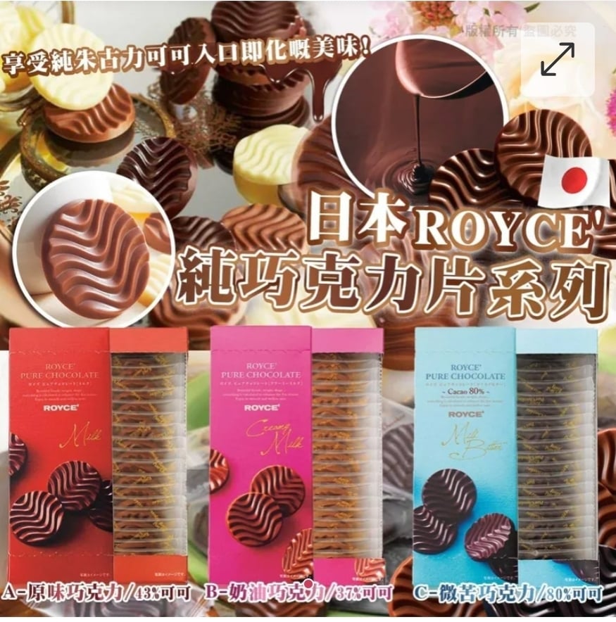 $68盒.2盒或以上$58盒.新年團)日本Royce純巧克力片