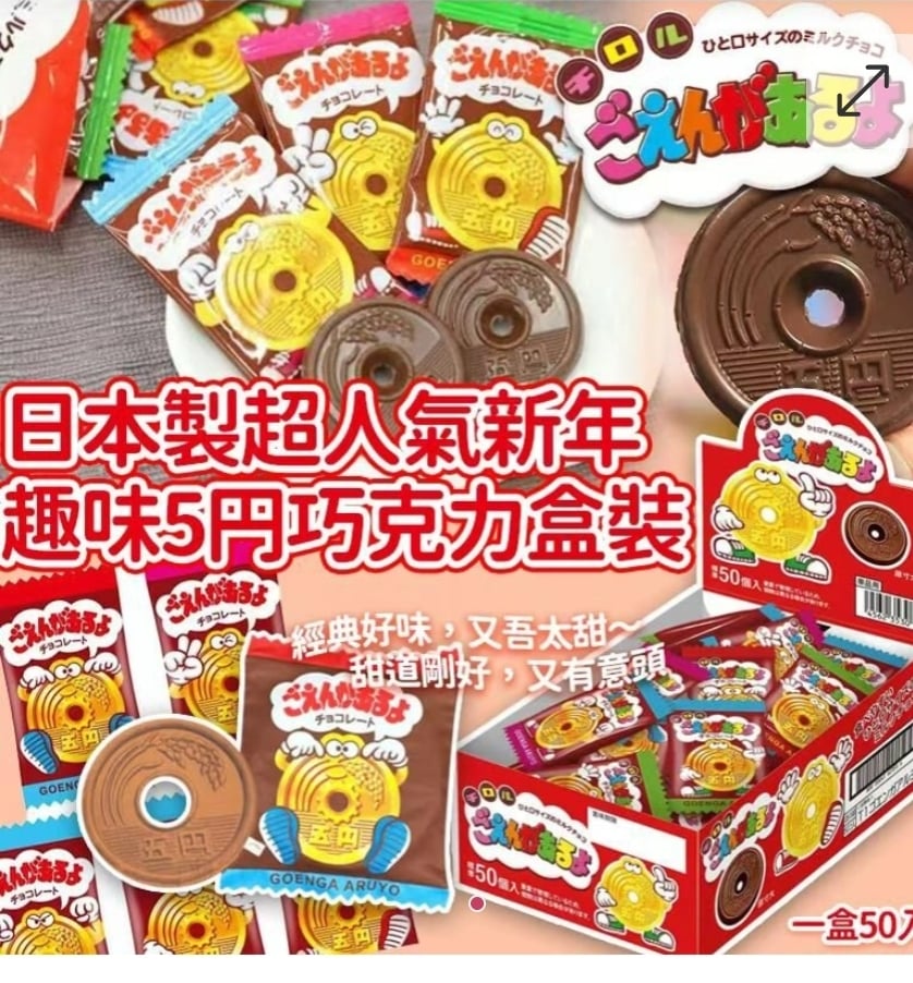$68盒.2盒或以上每盒$58盒.日本超人氣新年趣味5円巧克力盒裝(一盒50入)