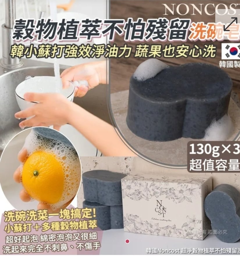 $68盒3入。 2盒或以上:$58盒。 韓國 Noncost 超淨穀物植萃不怕殘留洗碗皂 (1盒3入) ⛔截單日期:2025/12/16 06:00PM 📦預計貨到日:2月尾 🇰🇷韓國Noncost 超淨穀物植萃不怕殘留洗碗皂 ✨洗碗+洗菜一次搞定!這塊皂真的超級方便~✨ 最近超多人在問的就是這款 「韓國Noncost 超淨穀物植萃不怕殘留洗碗皂」 一試直接愛上!😍 🌿 天然派站出來!穀物植萃+小蘇打真的太可以! 採用小蘇打×多種穀物植萃(青江菜、糙米、黑豆等) 溫和清潔 ✔ 安心清洗 ✔ 不怕殘留 ✔ 洗起來完全沒有刺鼻味,手手也不會乾澀的那種!💚 🍋 蔬果也能安心洗!不只是洗碗皂而已~ 它真的可以用來清洗水果、蔬菜! 葡萄、番茄、小黃瓜都能洗得清清爽爽~ 媽媽看到直接點頭:這個我可以!💛 🔥 小蘇打強效淨油力超有感! 煎魚鍋、油炸鍋、咖哩鍋都不怕~ 沾濕的海綿在皂上輕鬆轉兩圈 🫧綿密泡泡立刻爆出來 油垢直接滑掉,洗起來超療癒! 💧 超好起泡、不刺激、不滑手! 泡泡細緻綿密,不殘黏、不乾澀 洗完的手依然柔柔嫩嫩,敏弱型也能安心用~ 📦 130g×3 入超值容量組,一組用超久! 固體皂超耐用,一塊可以用很久~ 又不佔空間、也不會流來流去,放哪裡都好看! 這塊直接閉眼入手就對了~💚🙌 -規格:1盒3入,每入130g -產地:韓國 ==⚠️ 聲明 ⚠️== 1.本貨品為平行進口正貨。 2.所有帖文內容只作分享及參考用途。為免混淆視聽,所有商標或版權均屬有關商品品牌商標的持有人,敬請留意。 3.空運/海運有可能因各種不明因素影響而延誤到貨,所有貨品一經訂購後,如非廠家缺貨,不設取消/退貨/換貨。 4.貨品在運輸途中導致產品包裝外盒有任何損毀凹陷,但不影響其產品本身食用/使用,或有機會不預設外盒出貨,我司不會作任何更換或退款。 5.以上資料及外盒包裝只供參考,商品外盒原廠有更換新包裝權利,一切以實物為準。 6.顏色或因拍攝器材或顯示螢幕等因素而與實物有異,以上圖片及文字僅供參考,一切以實物為準。
