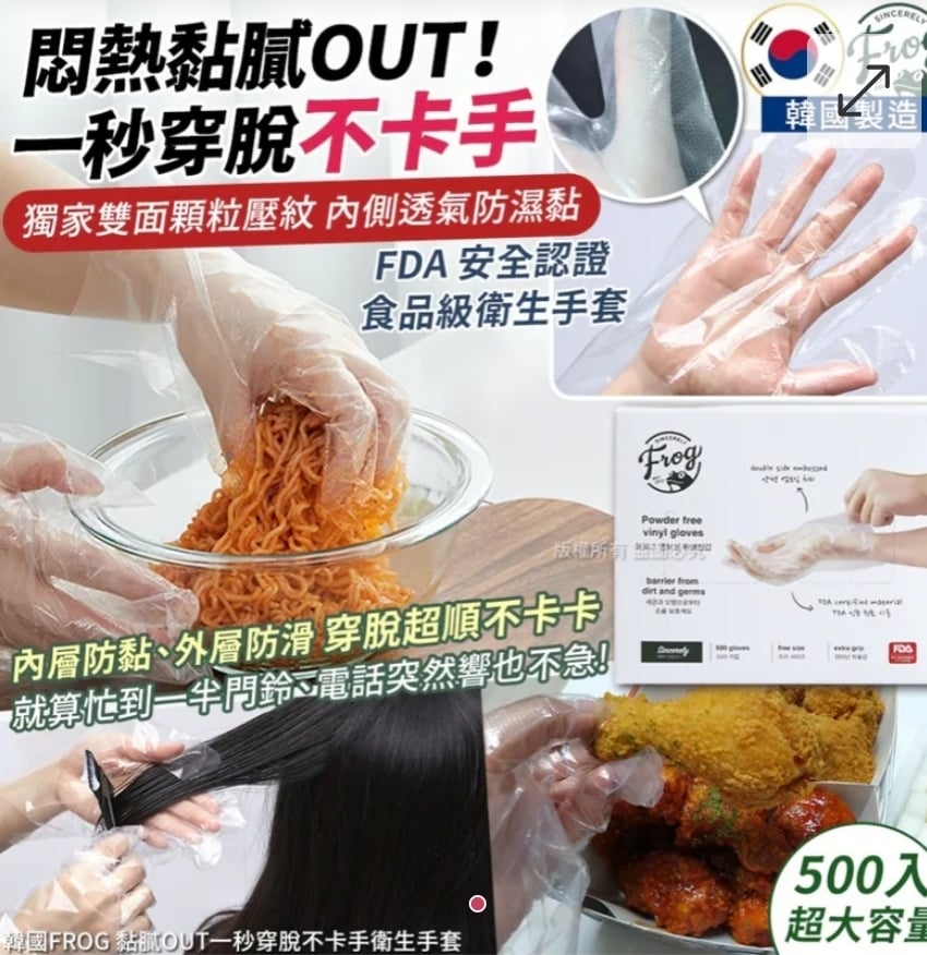 $68盒500入。 2盒或以上:$58盒。 韓國 FROG 一秒穿脫不卡手衛生手套 (1盒500入) ⛔截單日期:2025/12/22 06:00PM 📦預計貨到日:2月尾 🥵「戴手套很悶?」 😩「脫手套像拔皮?」 🙅♀️這些煩惱,現在通通說掰掰~! 🌬️悶熱OUT!黏膩OUT!卡手OUT! ✨韓國FROG 黏膩OUT一秒穿脫不卡手衛生手套✨ 這副手套直接打趴你的手汗焦慮👋💦 🌟獨家雙面顆粒壓紋設計 🧤內側透氣防濕黏,外側防滑不卡卡 穿脫流暢像變魔術🎩 📌 FDA食品級安全原料認證 📌 透明好穿、服貼不卡指 📌 500入大容量,居家備用最夠用! 🍱 不論拌菜、握壽司、做便當、包三明治 🎨 或是染髮、美容、清潔、油漆都OK! 📞 就算正在忙,門鈴響 or 電話來也能秒速脫手套,優雅接起來! -規格:1盒500入 -產地:韓國 ==⚠️ 聲明 ⚠️== 1.本貨品為平行進口正貨。 2.所有帖文內容只作分享及參考用途。為免混淆視聽,所有商標或版權均屬有關商品品牌商標的持有人,敬請留意。 3.空運/海運有可能因各種不明因素影響而延誤到貨,所有貨品一經訂購後,如非廠家缺貨,不設取消/退貨/換貨。 4.貨品在運輸途中導致產品包裝外盒有任何損毀凹陷,但不影響其產品本身食用/使用,或有機會不預設外盒出貨,我司不會作任何更換或退款。 5.以上資料及外盒包裝只供參考,商品外盒原廠有更換新包裝權利,一切以實物為準。 6.顏色或因拍攝器材或顯示螢幕等因素而與實物有異,以上圖片及文字僅供參考,一切以實物為準。