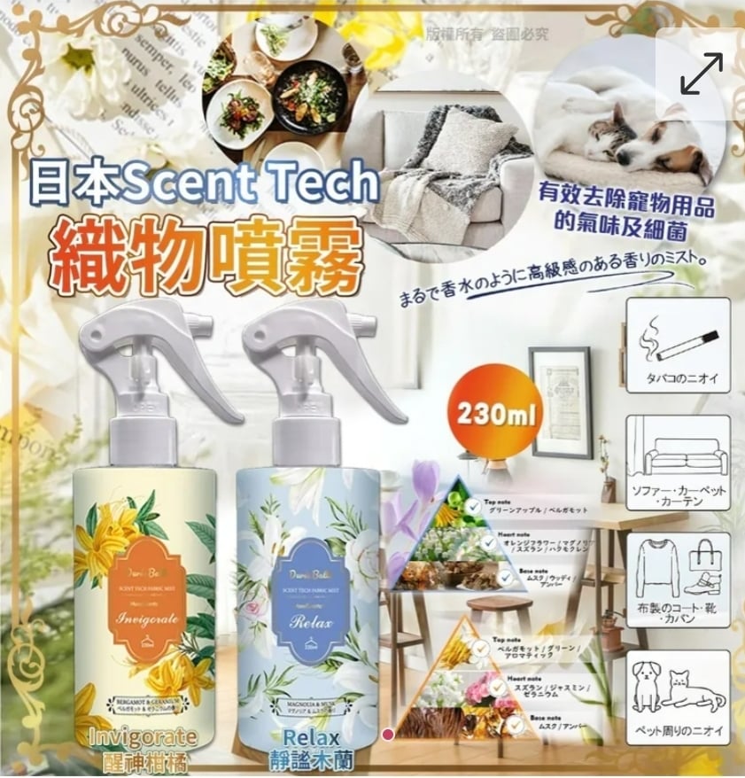$75枝. 2枝或以上$65枝. 日本 Scent Tech 織物芳香噴霧 230ml ⛔截單日期:2025/12/22 06:00PM 📦預計貨到日: 2月中 A-Invigorate — 醒神柑橘 B-Relax — 靜謐木蘭 日本最新出 🥰日本女生大讚既織物芳香噴霧,💖 唔止係香水咁簡單~原來香味仲可以調整心情! 👉 除臭+消毒+高級香氛一次搞掂,香氣仲係來自瑞士頂級香氛公司 Givaudan!高級感香氣媲美香水🌺😍 💛 Invigorate — 醒神柑橘(佛手柑 & 天竺葵) ✨「活力開關 ON!」✨ Top note:佛手柑、清新綠意、草本香氣 Heart note:鈴蘭、茉莉、天竺葵 Base note:麝香、琥珀 🌞 明亮清新的柑橘調,帶有柔和的花香點綴。清新卻不刺鼻,像夏日晨光般喚醒感官,令人精神一振,特別適合上班前、運動後、需要打起精神的時刻使用。 💜 Relax — 靜謐木蘭(木蘭花 & 麝香) ✨「溫柔釋放壓力,讓心回到平靜」✨ Top note:青蘋果、佛手柑 Heart note:橙花、木蘭、鈴蘭、玉蘭 Base note:麝香、木質調、琥珀 🌙 優雅花香與溫潤麝香的結合,帶來輕盈卻細膩的氛圍。既有清新的透明感,又隱約散發溫暖與柔情,適合睡前、休息時或需要舒緩壓力的時候。 ▪️容量:230ml ▪️功效:芳香、消臭、除菌 ▪️適用範圍:衣物、床單、布藝沙發、車內、房間空間 ==⚠️ 聲明 ⚠️== 1.本貨品為平行進口正貨。 2.所有帖文內容只作分享及參考用途。為免混淆視聽,所有商標或版權均屬有關商品品牌商標的持有人,敬請留意。 3.空運/海運有可能因各種不明因素影響而延誤到貨,所有貨品一經訂購後,如非廠家缺貨,不設取消/退貨/換貨。 4.貨品在運輸途中導致產品包裝外盒有任何損毀凹陷,但不影響其產品本身食用/使用,或有機會不預設外盒出貨,我司不會作任何更換或退款。 5.以上資料及外盒包裝只供參考,商品外盒原廠有更換新包裝權利,一切以實物為準。 6.顏色或因拍攝器材或顯示螢幕等因素而與實物有異,以上圖片及文字僅供參考,一切以實物為準。