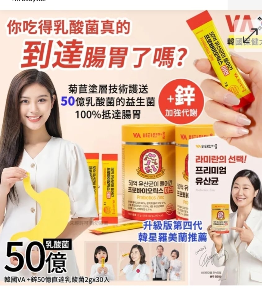 $75桶. 2桶或以上:$65桶. 韓國 VA +鋅50億直達乳酸菌 (1桶30條) ⛔截單日期:2025/12/16 06:00PM 📦預計貨到日: 2月尾 🔥優質第4代乳酸菌🔥 🔥連鋅也滿滿一包🔥 最新推出的產品! 光看產品名稱就知道 益生菌成份整整添加了 ⚜️ 50億!!! 你吃的乳酸菌真的到腸胃了嗎? 💕💕利用菊苣凍幹保護菌株的專利技術! 護送你的益生菌直達腸胃 達到100%的目的⚡⚡ 其中含有【17種不同的益生菌+3種乳酸菌】 😍😍可以幫助消化、促進排便、改善功能性腸道問題 也有強健身體、幫助入睡、改善過敏體質等功效 -規格 : 1桶30條,每條2g -產地 : 韓國 ==⚠️ 聲明 ⚠️== 1.本貨品為平行進口正貨。 2.所有帖文內容只作分享及參考用途。為免混淆視聽,所有商標或版權均屬有關商品品牌商標的持有人,敬請留意。 3.空運/海運有可能因各種不明因素影響而延誤到貨,所有貨品一經訂購後,如非廠家缺貨,不設取消/退貨/換貨。 4.貨品在運輸途中導致產品包裝外盒有任何損毀凹陷,但不影響其產品本身食用/使用,或有機會不預設外盒出貨,我司不會作任何更換或退款。 5.以上資料及外盒包裝只供參考,商品外盒原廠有更換新包裝權利,一切以實物為準。 6.顏色或因拍攝器材或顯示螢幕等因素而與實物有異,以上圖片及文字僅供參考,一切以實物為準。