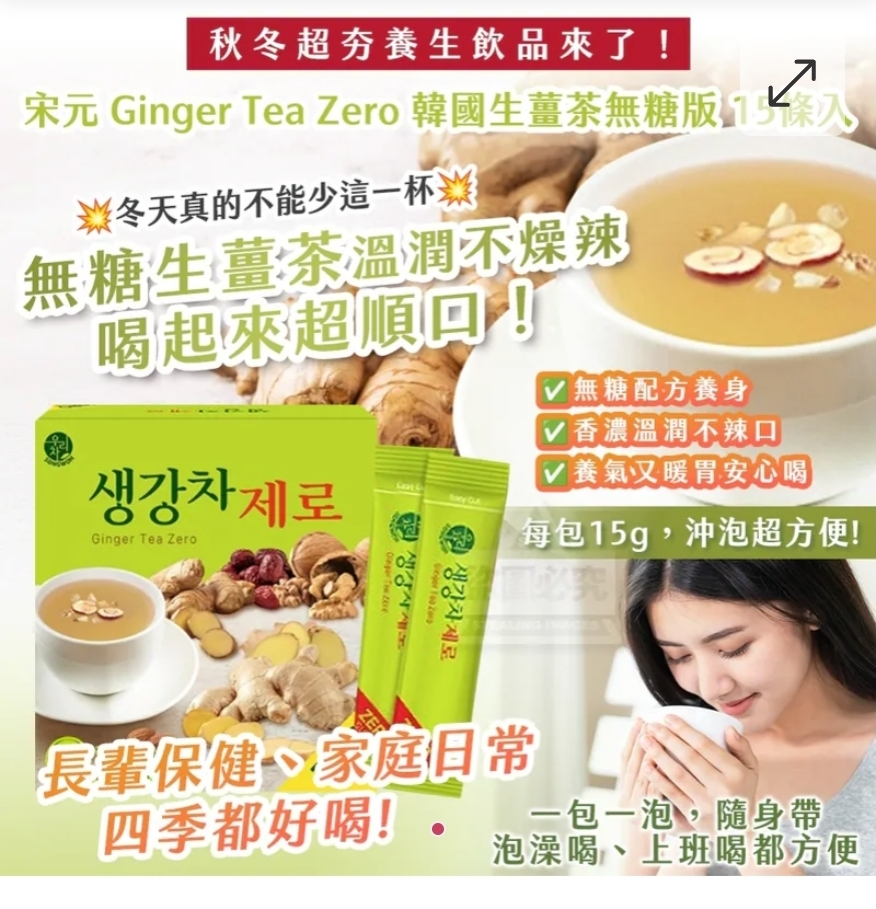 $75盒。 2盒起$65盒。 韓國製造-宋元 Ginger Tea Zero 韓國生薑茶無糖版 15條入 ⛔截單日期:2025/10/30 06:00PM 📦預計貨到日: 12月尾 秋冬超夯養生飲品來了!| 🔥控糖族群、手腳冰冷族、喝膩甜茶的你看過來! 📦 一盒 15條,每包15g,沖泡超方便! 💥冬天真的不能少這一杯💥 🌱無糖生薑茶,溫潤不燥辣,喝起來超順口! ➤ 不加糖!不膩口!連早晨空腹也能安心喝 ➤ 每天一杯溫熱生薑茶,從內而外暖到心坎 ➤ 超適合手腳冰冷、氣血循環差的人! ✨獨家成分加持: ✔ 生薑萃取 3.7%(自然暖身無負擔) ✔ 紅棗 2%(養顏補氣、溫潤加分) ✔ 核桃、杏仁、胡桃萃取(香氣層次更豐富) 🌟 三大族群必備🌟 👩💻 辦公族:室內冷氣吹整天,循環差、易手腳冰冷 👵 體寒族:睡前喝一杯,好眠又不虛寒 👨👩👧👦 長輩保健、家庭日常,四季都好喝! 📌 商品資訊 ・內容:225g(15g × 15條) ・熱量:每條90大卡 📦 可加牛奶/豆漿更香濃,加熱飲用更暖心! 🔥現在天氣轉涼,還沒備好暖心茶就太慢了! 一包一泡,隨身帶、泡澡喝、上班喝都方便, ✅ 無糖配方養身 ✅ 香濃不辣口 ✅ 養氣又暖胃 趁這波優惠快+1!錯過等明年~ 【商品規格】- 📍產地: 韓國 📍規格: 15條入 📍效期: 依每批效期所示 ==⚠️ 聲明 ⚠️== 1.本貨品為平行進口正貨。 2.所有帖文內容只作分享及參考用途。為免混淆視聽,所有商標或版權均屬有關商品品牌商標的持有人,敬請留意。 3.空運/海運有可能因各種不明因素影響而延誤到貨,所有貨品一經訂購後,如非廠家缺貨,不設取消/退貨/換貨。 4.貨品在運輸途中導致產品包裝外盒有任何損毀凹陷,但不影響其產品本身食用/使用,或有機會不預設外盒出貨,我司不會作任何更換或退款。 5.以上資料及外盒包裝只供參考,商品外盒原廠有更換新包裝權利,一切以實物為準。 6.顏色或因拍攝器材或顯示螢幕等因素而與實物有異,以上圖片及文字僅供參考,一切以實物為準。