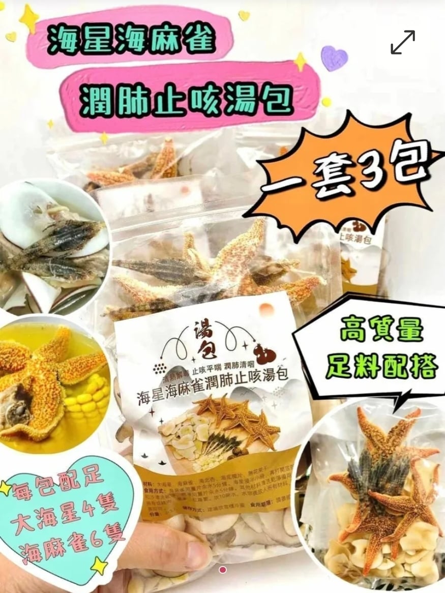 $78套.2套起$68套。套裝海星海麻雀潤肺止咳湯-1套3包