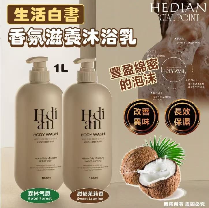 $78支。2支起$68支。 韓國🇰🇷生活白書 HEDIAN 香氛滋養沐浴乳1L 2種香味選擇:甜郁茉莉香Sweet Jasmine/森林氣息Hotel Forest 新品來啦📣📣 👉在繁忙日常中,何不將沐浴時光,昇華為一場專屬的感官儀式?「赫典 AROMA DAILY MOISTURE 身體沐浴露」以其獨特魅力,為您帶來從感官到肌膚的全面寵愛。💖 🔆我們精心調配兩款高級香氛:靈感源自森林的 「Hotel Forest」,以佛手柑、柑橘與綠意香調交織,彷彿置身於晨光與露水浸潤的靜謐林木間;🌲而 「Sweet Jasmine」 則捕捉了甜美茉莉🌸在陽光下的綻放瞬間,伴隨著桃子的果香與溫暖麝香,勾勒出優雅而感性的層次。每一次沐浴🛀🏻,都是一段持久縈繞的嗅覺旅行。 不僅如此,我們更追求卓越的洗護體驗。配方採用椰子🥥來源的溫和界面活性劑,經測試證實為低刺激性,能搓揉出豐盈綿密的泡沫,🫧溫和帶走髒污的同時,絕不帶走肌膚所需水💧💧💧分。更添加3種植物萃取與4種天然油養護,並結合神經醯胺NP、鈉豆醯胺與泛醇等保濕成分,實證能一次改善肌膚油水平衡達64.9%,使用後肌膚觸感清爽潔淨,卻洋溢著從未有過的水潤飽滿與柔軟。🥰 💯100%的使用者一致認可其改善異味、調理油水與迷人香氣!讓每一次的沐浴,🛀🏻都不只是清潔,更是為肌膚注入長效保濕力,帶來極致愉悅與滿足的自我呵護時刻。💋 「赫典 AROMA DAILY MOISTURE 身體沐浴露」— 讓您的肌膚,從此告別乾澀,沐浴在水潤與芬芳交織的幸福裡。 產地 韓國🇰🇷