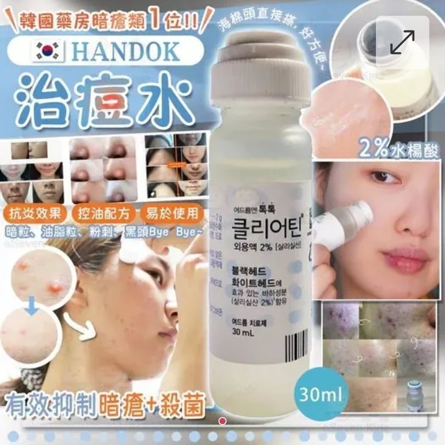 $78支. 2支或以上$68支. 韓國藥房出品Handok 祛痘水30ml ⛔截單日期:2025/11/24 06:00PM 📦預計貨到日:2026年1月中 👏👏痘痘救星🦾🦾被譽為清痘擦膠筆🤏🏻 👇呢支係韓國藥房NO.1 🏆袪暗瘡產品✨ 🇰🇷韓國藥房出品Handok祛痘水 30ml 支勁呀👍👍韓妹必用的痘痘治療款🌟, 網上有好多韓妹share對比圖同心得真係勁吸引😍 好多朋友去韓國旅行都指定要買呢支🉐🉐,因為真係WORK。韓劇 <女神降臨> 文佳煐同款!女主角 落妝後都有用呢支去護理皮膚🙌 尤其係青春期嘅少男少女, 塊面生滿暗瘡, 油脂粒, 暗粒,搽呢支好有效🉐🉐 🟡主要的成分是 salicylic acid 水楊酸 含2% ➡ 抑制 p.acnes痤瘡杆菌增生, 有效抑制暗瘡+殺菌。 而且可以做到溶解角質 令到毛孔少啲阻塞, 減少暗粒生成✌。 除了暗瘡,黑頭粉刺比較多的位置也可以重點塗抹👊 海棉頭設計😂, 搽上去涼涼😙,質地容易吸收,只要輕輕hi一hi生暗瘡位置就可以了🙌 未熟 在谷住谷住的痘痘也可以用,佢連暗粒都消到平真心正呀😸😸 ✅去痘有幫助 ✅預防長痘痘 ✅可用於任何類型的暗瘡,脂肪粒,暗粒 , 油脂粒, 粉刺, 黑頭 ✅消炎功效,爆濃頭痘痘都得 ✅減少皮脂細胞間的凝集 ,能把堵塞毛孔的角質去除 ✅炎症性痘痘 及 非炎症性痘痘,都起到抗炎的效果 🧐每日2次,早晚用 🧐洗臉後第一步使用 局部塗抹 🧐局部搽在閉口,痘痘處 🙅不要搽到眼上 -產地:韓國 -規格:30ml -保存期限:2027年09月24日 -保存方式:避免陽光直射,請置於陰涼乾燥。 -注意事項: ※請確保將產品放在孩童和寵物接觸不到的地方。 ※使用後如有不適,請暫停使用並諮詢專業醫師。 ==⚠️ 聲明 ⚠️== 1.本貨品為平行進口正貨。 2.所有帖文內容只作分享及參考用途。為免混淆視聽,所有商標或版權均屬有關商品品牌商標的持有人,敬請留意。 3.空運/海運有可能因各種不明因素影響而延誤到貨,所有貨品一經訂購後,如非廠家缺貨,不設取消/退貨/換貨。 4.貨品在運輸途中導致產品包裝外盒有任何損毀凹陷,但不影響其產品本身食用/使用,或有機會不預設外盒出貨,我司不會作任何更換或退款。 5.以上資料及外盒包裝只供參考,商品外盒原廠有更換新包裝權利,一切以實物為準。 6.顏色或因拍攝器材或顯示螢幕等因素而與實物有異,以上圖片及文字僅供參考,一切以實物為準。