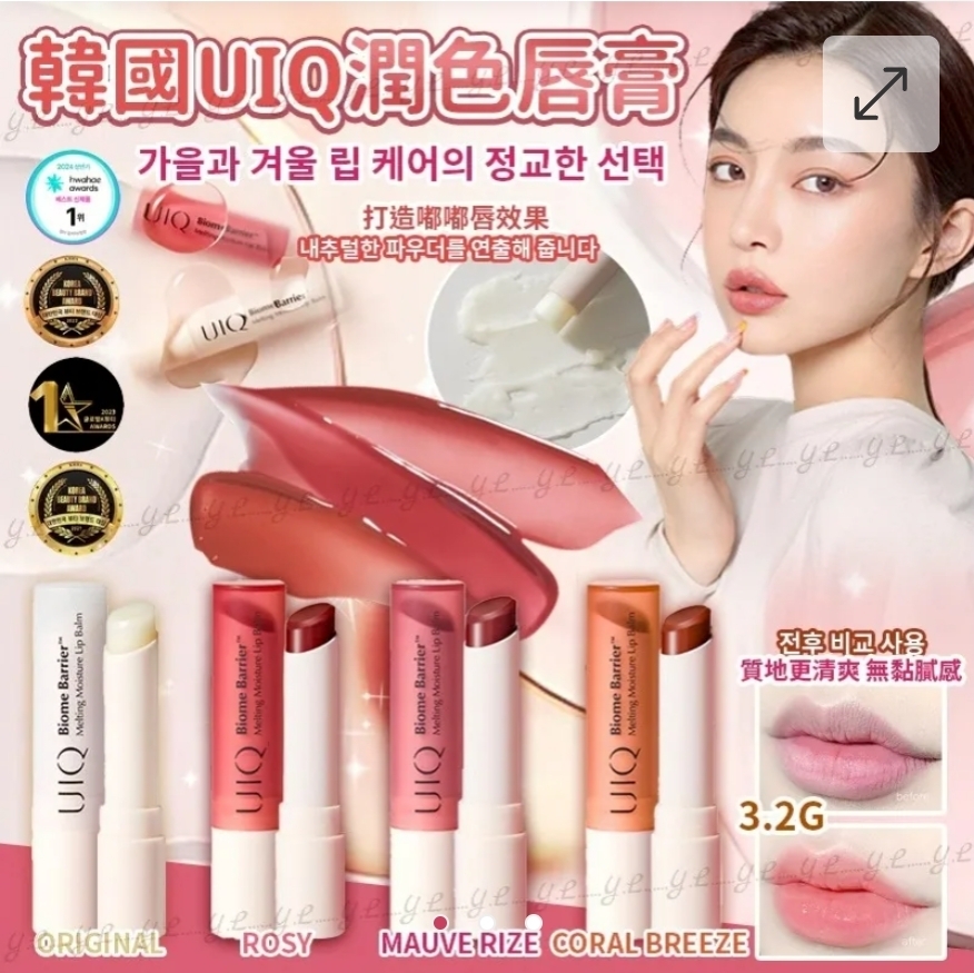 $78支. 2支或以上$70支. 韓國UIQ保濕潤色唇膏 3.2g ⛔截單日期:2025/10/06 06:00PM 📦預計貨到日:11月中 #ORIGINAL #ROSY #MAUVE RIZE #CORAL BREEZE 💄✨韓國小眾爆紅✨【韓國UIQ保濕潤色唇膏 3.2g】 每日素顏都可以靚得自然~🥰 韓國UIQ潤色唇膏,細緻水潤質地,一抹即時提升氣色,唔乾唔顯唇紋,好似天生好唇色咁自然~ 🌸 產品亮點: ✔ 潤色同時滋潤,雙效合一 ✔ 顯色自然,適合素顏/淡妝 ✔ 輕盈質地,無厚重感 ✔ 迷你size,袋仔必備 -產地:韓國 -規格:3.2g -保存期限:商品銷售速度快,依實際出廠為主。 -保存方式:避免陽光直射,請置於陰涼乾燥。 -注意事項: ※請確保將產品放在孩童和寵物接觸不到的地方。 ※使用後如有不適,請暫停使用並諮詢專業醫師。 ※如不小心噴到眼睛,請用清水沖洗10-15分鐘後,請立即就醫諮詢專業醫師。 ==⚠️ 聲明 ⚠️== 1.本貨品為平行進口正貨。 2.所有帖文內容只作分享及參考用途。為免混淆視聽,所有商標或版權均屬有關商品品牌商標的持有人,敬請留意。 3.空運/海運有可能因各種不明因素影響而延誤到貨,所有貨品一經訂購後,如非廠家缺貨,不設取消/退貨/換貨。 4.貨品在運輸途中導致產品包裝外盒有任何損毀凹陷,但不影響其產品本身食用/使用,或有機會不預設外盒出貨,我司不會作任何更換或退款。 5.以上資料及外盒包裝只供參考,商品外盒原廠有更換新包裝權利,一切以實物為準。 6.顏色或因拍攝器材或顯示螢幕等因素而與實物有異,以上圖片及文字僅供參考,一切以實物為準。