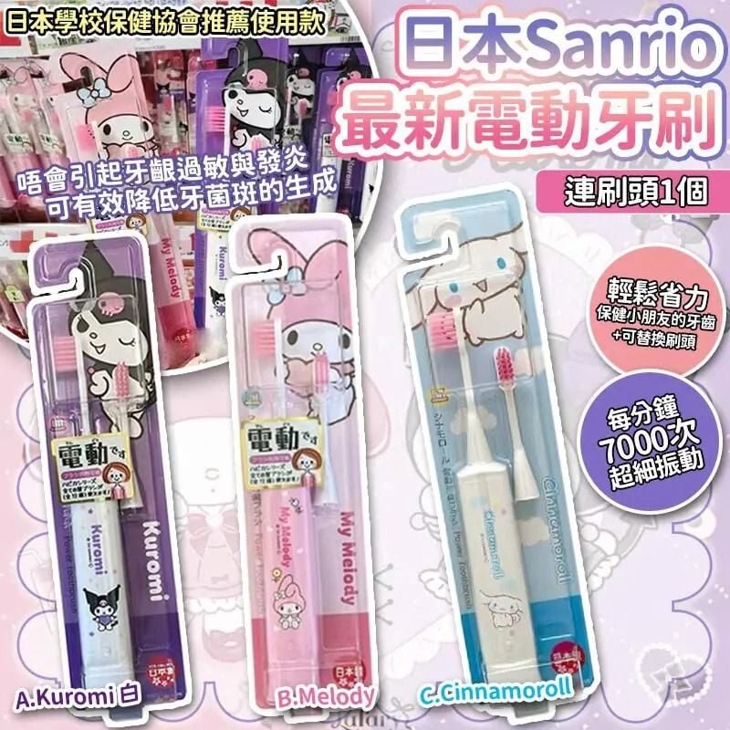 $78支. 2支或以上每支$68支. 日本Sanrio最新電動牙刷連刷頭1個 ⛔截單日期:2025/11/24 06:00PM 📦預計貨到日:2026年1月中 A) Kuromi B) Melody C) Cinnamoroll 😱WoW 🔥🔥🔥 每分鐘可震動7000回,日本學校保健協會推薦使用款👍唔會引起牙齦過敏與發炎可有效降低牙菌斑的生成,輕鬆省力保健小朋友的牙齒➕可替換刷頭😁😆 日本製🇯🇵電動牙刷 日本直送 🔲每分鐘7000次超細振動,同時用牙膏按摩去除牙菌斑。用細小刷頭清潔口腔每個細縫,兒童牙刷適合大人使用,更能清潔一般牙刷難以清除的死角。 ✅產地:日本 ✅電源:3號電池1顆 ✅震動次數:約7,000回/分鐘 ✅材質:ABS樹脂(本体)/PP(牙刷柄部) ✅尺寸:17.3x2.5x2.1 cm ==⚠️ 聲明 ⚠️== 1.本貨品為平行進口正貨。 2.所有帖文內容只作分享及參考用途。為免混淆視聽,所有商標或版權均屬有關商品品牌商標的持有人,敬請留意。 3.空運/海運有可能因各種不明因素影響而延誤到貨,所有貨品一經訂購後,如非廠家缺貨,不設取消/退貨/換貨。 4.貨品在運輸途中導致產品包裝外盒有任何損毀凹陷,但不影響其產品本身食用/使用,或有機會不預設外盒出貨,我司不會作任何更換或退款。 5.以上資料及外盒包裝只供參考,商品外盒原廠有更換新包裝權利,一切以實物為準。 6.顏色或因拍攝器材或顯示螢幕等因素而與實物有異,以上圖片及文字僅供參考,一切以實物為準。