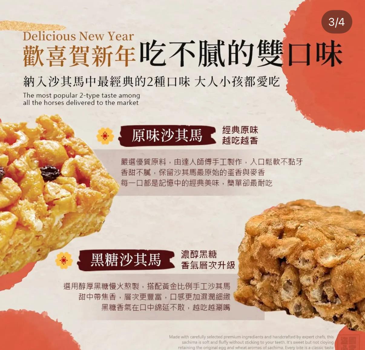 $78盒,2盒起$68盒, 馬到福來 沙琪瑪手提箱 🧧新年禮盒🎁預購 🌟早鳥優惠🌟 🥐 經典原味 × 黑糖口味 老廠古早味 🍯 原味沙琪瑪 經典原味,越吃越香 嚴選優質原料,古早味 入口鬆軟、不黏牙、甜香不膩 保留沙其馬最原始的蛋香與麥香 🍂 黑糖沙琪瑪 濃醇黑糖、香氣層次升級 選用特厚黑糖慢火熬煮 搭配高比例手工沙其馬 香氣更濃、層次更豐富 🌱 台灣優選大廠製作|健康低糖×清爽不膩 香、酥、軟、綿一次到位 甜度剛剛好 真正好吃的沙琪瑪靠的就是「優質食材原料」 精挑細選高成本原物料👇 ✔手作更有層次感 ✔濃郁細緻撲鼻香 ✔甜而不膩一口接一口 🔍 產品資訊🔍 ▪ 產地:台灣 ▪ 保存期限:6個月 ▪ 內容物:原味雞蛋*9 古早黑糖*9 ▪ 產品重量:約20g/1入 ▪禮盒尺寸:205*140*100mm 截單日:12月31日12:00 預計到貨日:2月上旬到港