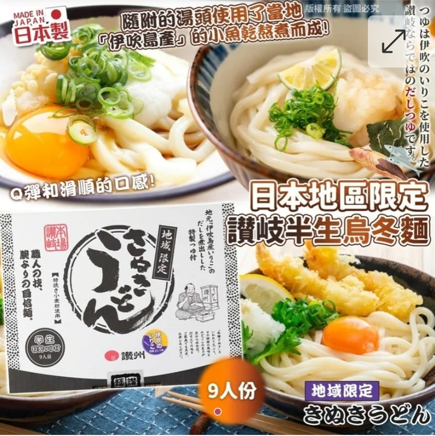 $78盒. 2盒或以上$68盒. 日本地區限定讃岐半生烏冬麵9人份 ⛔截單日期:2025/11/14 06:00PM 📦預計貨到日:2026年1月尾 🍜🇯🇵日本地區限定‼香川縣直送「讃岐半生烏冬」,彈牙又煙韌的麵身😋配上鮮香魚介湯底🫶🏻 簡直就係日本居酒屋水準💯~一盒煮到9份,超抵呀‼‼ 🏆 日本人心中嘅No.1國民麵食 「讃岐烏冬」係香川縣名物📍 麵條粗身、有嚼勁、滑溜得嚟仲保留小麥香🤤 配上伊吹島小魚乾熬製的特製湯底, 一碗香氣滿滿、清澈又濃厚的烏冬💥,令人一試愛上! 💟職人使用特殊研磨的小麥粉,加入大量水分,經過多道揉麵和靜置的工序製成麵條 💟特製湯汁由伊吹島產的小魚乾熬煮而成,濃郁清香 💟可按照個人喜好,烹煮成釜揚烏龍麵、掛烏龍麵 or 冷湯烏龍麵 ⚠本產品含大豆、小麥、鯖魚,過敏者慎用⚠ ▪內容:麵條300g x 3、醬油包25ml x 9 ▪原產地:日本製造 ▪有效期:生產日起120日 ▪保存方法:在室溫下保存,避免陽光直射、高溫、潮濕的地方。 ==⚠️ 聲明 ⚠️== 1.本貨品為平行進口正貨。 2.所有帖文內容只作分享及參考用途。為免混淆視聽,所有商標或版權均屬有關商品品牌商標的持有人,敬請留意。 3.空運/海運有可能因各種不明因素影響而延誤到貨,所有貨品一經訂購後,如非廠家缺貨,不設取消/退貨/換貨。 4.貨品在運輸途中導致產品包裝外盒有任何損毀凹陷,但不影響其產品本身食用/使用,或有機會不預設外盒出貨,我司不會作任何更換或退款。 5.以上資料及外盒包裝只供參考,商品外盒原廠有更換新包裝權利,一切以實物為準。 6.顏色或因拍攝器材或顯示螢幕等因素而與實物有異,以上圖片及文字僅供參考,一切以實物為準。