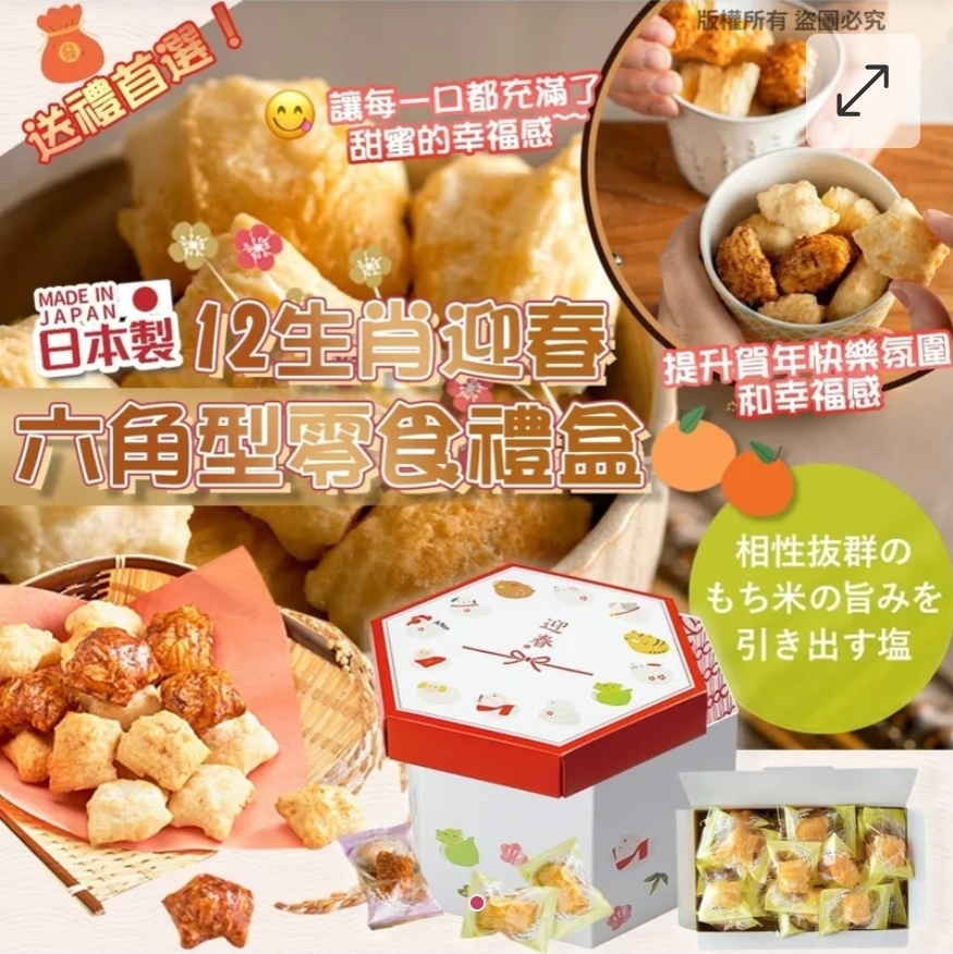 $78盒. 2盒或以上$68盒. 日本製-12生肖迎春六角型零食禮盒 ⛔截單日期:2025/11/17 06:00PM 📦預計貨到日:2026年1月尾 眨下眼又到年尾👀,係時候plan定🧧新年禮盒💝要準備咩啦~~ 🙅🏻♀唔好又送藍X曲奇、X莎呢D咁無聊🤷🏻♀ 重點推介💁🏻♀呢個日本限定12生肖米菓禮盒🎁 💯日本製作,嚴選國產糯米🌾 經慢火🔥烘烤至表面酥脆,但內裏蓬鬆 以突顯🍚米粒的香 & 甜😋 最後用秘制的調味料🧂,將米菓調製成各式風味🤩 由簡單的鹽味🧂,到華麗醬料香氣🥘,一次過享受😘 包裝盒係六角形設計,🎏畫上和風風格的12生肖動物😍 可愛精美的畫風,😻令人眼前一亮 💝收到一定好開心💝 ▪重量:一盒約110g ▪原產地:日本製造 ▪有效期:2026年3月31日或以後 ▪保存方法:在室溫下保存,避免陽光直射、高溫、潮濕的地方。 ==⚠️ 聲明 ⚠️== 1.本貨品為平行進口正貨。 2.所有帖文內容只作分享及參考用途。為免混淆視聽,所有商標或版權均屬有關商品品牌商標的持有人,敬請留意。 3.空運/海運有可能因各種不明因素影響而延誤到貨,所有貨品一經訂購後,如非廠家缺貨,不設取消/退貨/換貨。 4.貨品在運輸途中導致產品包裝外盒有任何損毀凹陷,但不影響其產品本身食用/使用,或有機會不預設外盒出貨,我司不會作任何更換或退款。 5.以上資料及外盒包裝只供參考,商品外盒原廠有更換新包裝權利,一切以實物為準。 6.顏色或因拍攝器材或顯示螢幕等因素而與實物有異,以上圖片及文字僅供參考,一切以實物為準。