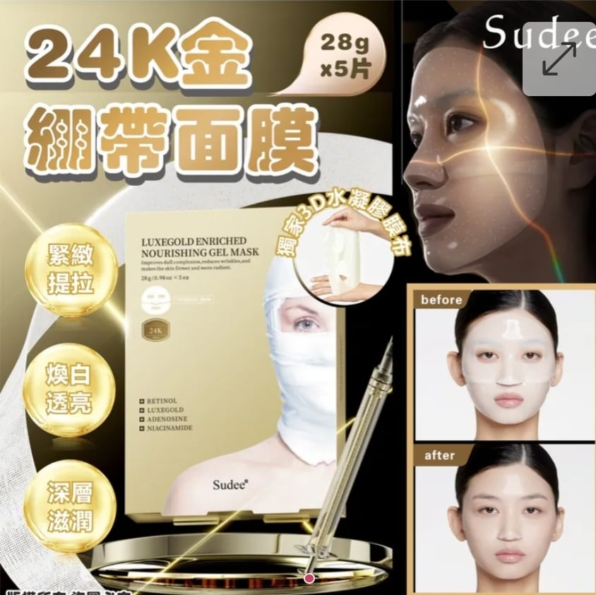 $78盒. 2盒或以上:$68盒. 韓國 Sudee 24K 金繃帶面膜 (1盒5片) ⛔截單日期:2025/11/24 06:00PM 📦預計貨到日:2026年1月尾 【LUXEGOLD 金繃帶面膜 - 院線級居家抗老革命!】 🔑【1片=4大院線項目】🔑 💛 黃金膠原炮 → 緊緻提拉 💉 肉毒級護理 → 撫平皺紋 ✨ 光子嫩膚 → 煥白透亮 💦 水光項目 → 深層滋潤 📊【28天實測見證奇蹟】📊 💪 緊緻彈力 +44.76% ✌️ 皺紋減少 -54.41% 💧 水光滋養 +47.92% 🌟【三大韓國專利成分】🌟 ☀️ MELAWAY™️ - 三重植萃提亮 🌿 COLLAGENEER™️ - 植物膠原引擎 💫 RETINOLSOME™️ - 雙A脂質體 💛【24K納米黃金科技】💛 ✅ 99.9%高純度真黃金 ✅ 納米級超導滲透 ✅ 模擬微電流導入 🧖♀️【獨家3D水凝膠膜布】🧖♀️ 🔹 繃帶式自適應緊貼 🔹 10倍高滲力直達肌底 🔹 隨附細節貼精準護理 ✨「敷1小時=肌底灌飽黃金膠原肽」✨ 讓肌膚白成反光板⚡️ 嫩如剝殼蛋🥚 -規格 : 1盒5片,每片28g ==⚠️ 聲明 ⚠️== 1.本貨品為平行進口正貨。 2.所有帖文內容只作分享及參考用途。為免混淆視聽,所有商標或版權均屬有關商品品牌商標的持有人,敬請留意。 3.空運/海運有可能因各種不明因素影響而延誤到貨,所有貨品一經訂購後,如非廠家缺貨,不設取消/退貨/換貨。 4.貨品在運輸途中導致產品包裝外盒有任何損毀凹陷,但不影響其產品本身食用/使用,或有機會不預設外盒出貨,我司不會作任何更換或退款。 5.以上資料及外盒包裝只供參考,商品外盒原廠有更換新包裝權利,一切以實物為準。 6.顏色或因拍攝器材或顯示螢幕等因素而與實物有異,以上圖片及文字僅供參考,一切以實物為準。