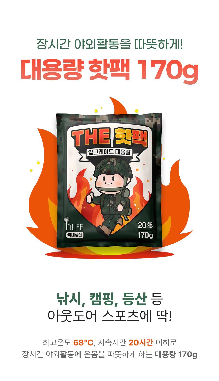 $78/10包。 韓國InLife The Hot Pack (인라이프 더 핫팩) 大容量暖暖包 這款暖暖包因其軍事風格的包裝和持久的保暖效果,在韓國被稱為「軍人暖暖包」或「阿兵哥暖暖包」,深受軍人及戶外活動愛好者喜愛 大容量設計:170g 的重量相比小型熱包提供更長時間的熱能釋放,適合寒冷天氣長時間使用。 升級款式:產品為新版升級型號,優化了發熱持續性與使用體驗。 便攜性強:輕便設計易於放入口袋、包內或保暖衣物中,隨時使用。 韓國制造:通常為國內生產產品,質量與安全性有保障。 🔥 產品功效與用途 ✔ 提供即時熱量,幫助抵抗寒冷環境 ✔ 適合在冬季戶外活動(如登山、滑雪、露營等)中使用 ✔ 可用於通勤、散步、體育運動、看比賽等場合 ✔ 對抗手腳冰冷、風寒感到不適時的便捷保暖選擇 🧴 使用方法 打開獨立包裝 將熱包放入口袋、手套或衣物層間 它會與空氣接觸後自動發熱,無需外部加熱 注意避免直接貼膚長期接觸以防低溫燙 訂貨需時7-14天