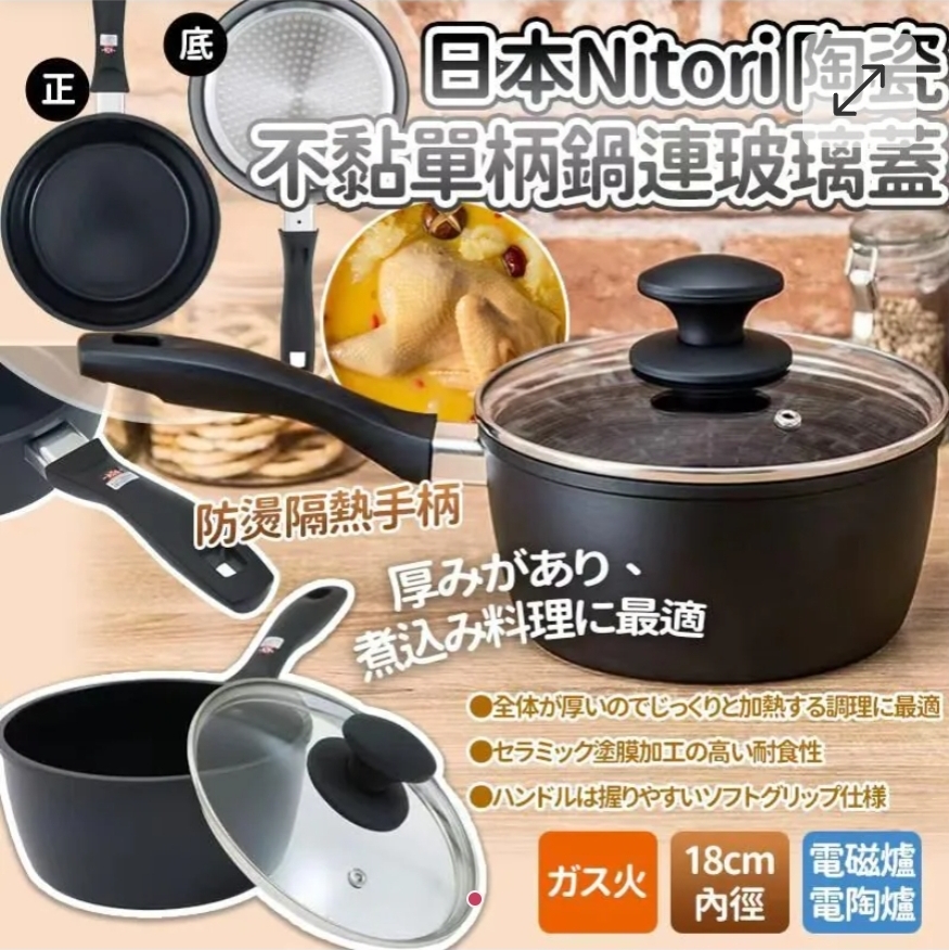 $85個.2個或以上每個$75個.日本Nitori陶瓷不黏單柄鍋連玻璃蓋(18cm)