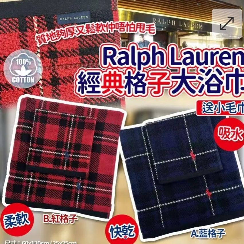 $85條. 2條或以上每條$75條. 日本冬季格子正版Ralph Lauren加厚大浴巾 ⛔截單日期:2025/11/26 06:00PM 📦預計貨到日:2026年1月中 A) 藍色 B) 紅色 ✨新年用新毛巾 今年度最後一團了~~仲傾到個有贈品offer 供應商年底大放送 送條毛巾仔呀,好開心 數量極少🉐🉐🉐要搶呀 今轉條紋厚身d, 勁耐用 用料好,全棉cotton ☁️防過敏,經典條紋色勁靚。 平時買條雜嘜沖涼大毛巾都要幾十蚊,仲要又薄又唔吸水😫😫沖完涼抹唔極唔乾,著衫感覺粘住粘住好唔舒服 觸感柔軟、吸水、快乾、超好用💜 沖涼後抹身或者抹汗都不會粘住皮膚,一抹就知有幾爽!! 耐洗又耐用👍🏻👍🏻 快乾同時防止毛巾發臭或者滋生細菌 質地夠厚又鬆軟仲唔怕甩毛 沖完涼包住 💦 大大支沖完涼都唔怕凍親❄,買定多幾條全家齊齊用。 💥尺寸:60x120cm / 25x25cm 💥中國代工 ==⚠️ 聲明 ⚠️== 1.本貨品為平行進口正貨。 2.所有帖文內容只作分享及參考用途。為免混淆視聽,所有商標或版權均屬有關商品品牌商標的持有人,敬請留意。 3.空運/海運有可能因各種不明因素影響而延誤到貨,所有貨品一經訂購後,如非廠家缺貨,不設取消/退貨/換貨。 4.貨品在運輸途中導致產品包裝外盒有任何損毀凹陷,但不影響其產品本身食用/使用,或有機會不預設外盒出貨,我司不會作任何更換或退款。 5.以上資料及外盒包裝只供參考,商品外盒原廠有更換新包裝權利,一切以實物為準。 6.顏色或因拍攝器材或顯示螢幕等因素而與實物有異,以上圖片及文字僅供參考,一切以實物為準。