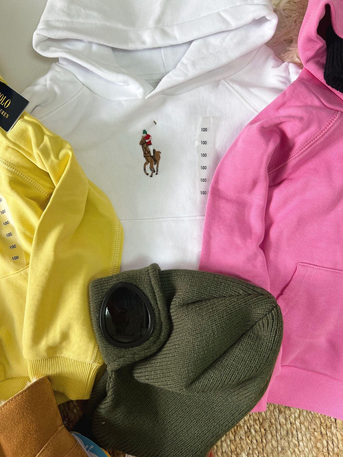$88件。 廠單RL彩色小馬連帽毛圈衛衣 截單日期:長訂 逢星期一11am / 售完即止 預計到貨日:3-6星期 🤍白色 🩷桃紅 💛黃色 Size 80 90 100 110 120 130 140 150