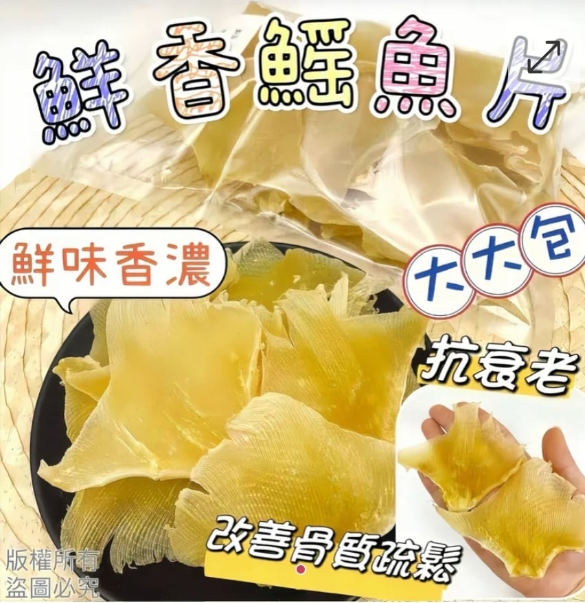 $88包, 2包或以上$78包, 鰩魚片300G ⛔截單日期:2025/11/15 06:00PM 📦預計貨到日: 2026年1月頭 鰩魚片別名又稱(蒲翅)老一代人好多都會叫蒲翅、但它並不是魚翅🙅♀️🙅♀️ 係因為用鰩魚嘅魚鰭曬乾而成、所以外形睇落好似魚翅😄 鰩魚係一種軟骨魚、所以含有豐富嘅軟骨素、而且蛋白質都非常多,以及有豐富嘅膠質同鈣質、有助於改善骨質及皮膚問題🥰天然膠質、有助抗衰老、有美容作用✌️軟骨素有效改善骨質疏鬆、生骨刺等問題、營養非常豐富 重點黎了💥💥我個人非常推薦大家購買👍因為此物煲湯係勁好飲、味道勁香、又鮮甜、反正味道同口感都好獨特、啖湯帶有濃濃嘅香味真係勁正🤤而且好百搭、簡單來講用左它唔需要落響螺片😁因為已經超越夠味了😘推薦推薦 簡單配搭: 鰩魚片、元肉、准山、杞子、元貝、蟲草花、豬骨、等等食材、各自配搭、煲1:30-2:00小時 浸泡方法: 清水浸半小時、怕腥可以加薑片一齊出水 重量:300g /包 存放方式:雪櫃 ==⚠️ 聲明 ⚠️== 1.本貨品為平行進口正貨。 2.所有帖文內容只作分享及參考用途。為免混淆視聽,所有商標或版權均屬有關商品品牌商標的持有人,敬請留意。 3.空運/海運有可能因各種不明因素影響而延誤到貨,所有貨品一經訂購後,如非廠家缺貨,不設取消/退貨/換貨。 4.貨品在運輸途中導致產品包裝外盒有任何損毀凹陷,但不影響其產品本身食用/使用,或有機會不預設外盒出貨,我司不會作任何更換或退款。 5.以上資料及外盒包裝只供參考,商品外盒原廠有更換新包裝權利,一切以實物為準。 6.顏色或因拍攝器材或顯示螢幕等因素而與實物有異,以上圖片及文字僅供參考,一切以實物為準。