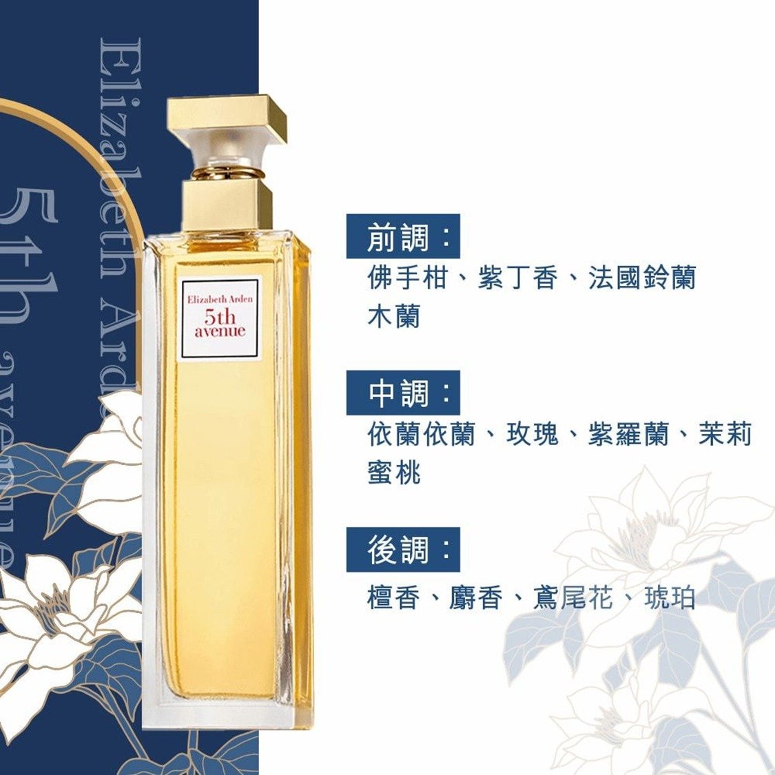 截單日期: 10月7日 預計到貨日期:11月中旬 $88支 . Elizabeth Arden雅頓 第五大道淡香水 30ml 5th Avenue Eau De Parfum 30ml 受經典建築和獨特的曼哈頓天際線的啟發,伊麗莎白雅頓第五大道捕捉了世界最著名街道的迷人風格。這款香水散發著紐約的活力和興奮,同時保持經典的女性氣質和奢華。 初調:佛手柑、紫丁香、法國鈴蘭、木蘭 中調:依蘭、玫瑰、紫羅蘭、茉莉、蜜桃、肉豆蔻、丁香 基調:檀香、麝香、鳶尾花、琥珀、香草 使用香水時,建議可噴灑至有脈搏跳動的部位,例如手腕內側、頸部、膝蓋後或手肘;或是直接噴灑在空氣中,再走過香霧之中,自然散發迷人芬芳。