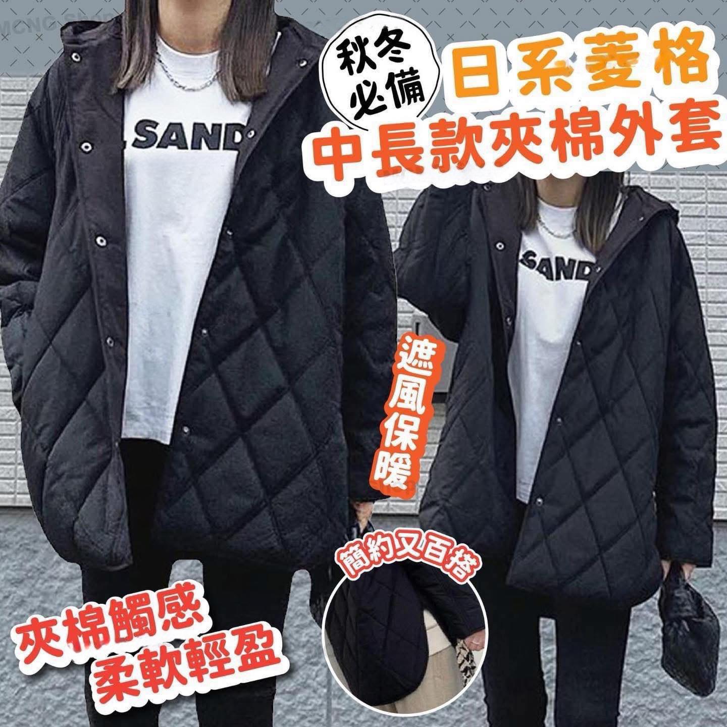 $95件。2件起$88件。👏🏻👏🏻秋冬必備, 日系菱格中長款夾棉外套🧥